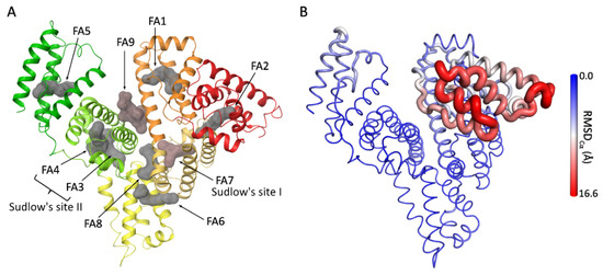 The 3D structure of murine serum albumin (MSA) has not been yet experimentally solved. However, there are several high-resolution crystallographic structures of its human homologue, HSA, available in the Protein Databank. HSA consists of six different subdomains (IA (residues 5–107), IB (residues 108–197), IIA (residues 198–296), IIB (residues 297–382), IIIA (residues 383–494), and IIIB (residues 495–569) [13]), which are connected by flexible loops (Figure 2). HSA’s well-characterized structure features three main drug-binding sites (Sudlow sites I and II in subdomains IIA and IIIA, respectively, as well as drug site III in subdomain IB) and nine fatty acid (FA) binding pockets (FA1–FA9), some of which are located at the subdomain interfaces (Figure 2A) [14,15,16,17]. Notably, HSA is an allosterically regulated protein (i.e., ligand binding at one site can alter the binding properties at others). For example, binding of ferric heme at FA1 significantly reduces drug affinity at Sudlow’s site I and, conversely, drugs binding at Sudlow’s site I can hinder ferric heme association [10]. Fatty acids also modulate ligand binding, as Sudlow site I ligands preferentially bind the FA-free state, while FA1 ligands show enhanced binding in the FA-bound conformation [10,18].