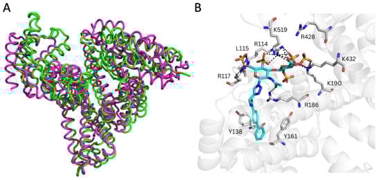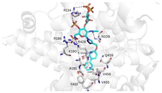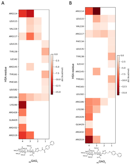 Moreover, the analysis of the representative REGAG/HSA complexes predicted by GlycoTorch and refined by MD revealed large structural fluctuations after approximately 50 ns of simulation, especially in subdomain IIIB as clearly inferred from the principal component analysis (Figure 3, Figures S3 and S4). This indicates that this region contributes most strongly to the dominant collective motions captured in the simulation and, therefore, it reflects possible rearrangements of the protein–ligand complexes over time. The free energies of binding along the MD trajectories computed with MM-GBSA [56,57] for the REGAG molecules (see Methods Section 2.4) indicated comparable binding (i.e., ΔGREGAG1 = −52.8 ± 1.6 kcal/mol; ΔGREGAG2 = −56.6 ± 4.6 kcal/mol; Table 2). The binding of each REGAG molecule to the heme site involved HSA residues across subdomains I and III, reflecting a cooperative interdomain interaction network. In particular, the disaccharide moiety of both REGAG molecules interacted with HSA residues Arg114, Leu115, Arg117, Arg145, Arg186, Lys190, Arg428, Lys432, and Lys519, while the biphenyl groups formed a stable sandwich between Tyr138 and Tyr161 (Figure 3B and Figure 4).