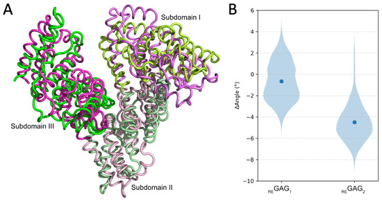 Conformational analysis of HSA in complex with REGAG molecules at the FA8 site in the most favorable recognition mode. (A) Principal component analysis of REGAG2 in complex with HSA. Superimposition of two MD-refined HSA structures, one shown in green and the other in pink, highlighting conformational displacements within the three subdomains—colored using gradients of the corresponding base color—captured by the first five principal components over 100 ns MD simulations. Figure generated with PyMOL v2.3. (B) MD-analysis of angles involving subdomains IA, IIB and IIIA of HSA in the closed conformation when complexed with the REGAG molecules. Violin representation of calculated angles from 100 ns MD simulations defined by the Cα carbon of residues P110, A364 and S427 of HSA (PDB ID 1H9Z). ΔAngle values correspond to the difference between the calculated angles over the MD trajectories and the angle from the initial structure. The mean is highlighted by a blue dot.