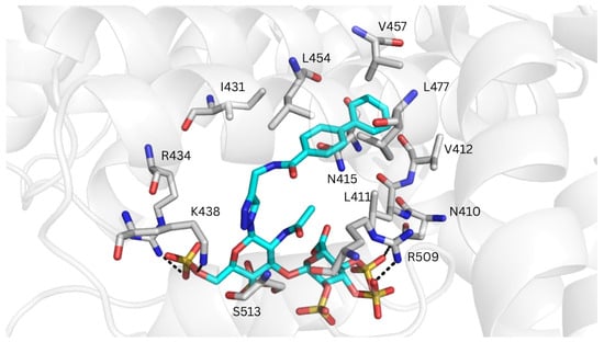 Only GlycoTorch predicted binding poses for REGAG1 at drug-binding site II, with the biphenyl group positioned within this region and the GAG moiety forming H-bonds with Lys438 (Figure S17A). This markedly differs from the results obtained for HSA, with no REGAG binding poses identified at this site. A plausible explanation for the distinct binding profiles observed in MSA may arise from differences at the entrance of the binding cavity, where the GAG moieties were located. In particular, Thr414 and Thr516 in MSA—corresponding to Gln390 and Glu492 in HSA—appear to make drug-binding site II more accessible. In addition, the size of the binding pocket in MSA seems wider than in HSA (Figure S18B), a feature that may be determinant for accommodating molecules of the size of the investigated REGAG molecules. The MD-refined structures showed extensive electrostatic interactions between the GAG moiety and Arg372, Lys375, Arg434, Lys438, and Arg509, and H-bonding with Asn410 and Ser513. In addition, the biphenyl groups made van der Waals contacts with Leu411, Val412, Asn415, Ile431, Leu454, Val457 and Leu477 (Figure 8). Interestingly, this recognition mode resembles those previously reported for commonly administered drugs that target site II of HSA. For instance, propofol is known to make hydrophobic interactions with Leu387, Ile388, Asn391, Leu407, and Val433, and a hydrogen bond with the main chain of Leu430 (corresponding to Leu411, Ile412, Asn415, Leu431, Val457, and Leu454 in MSA) [64]. In contrast, diazepam, diflunisal and ibuprofen exhibit a slightly different binding mode at drug-binding site II, primarily interacting with residues Leu387, Asn391, and Leu453 in HSA [13] (corresponding to Leu411, Asn415 and Leu477 in MSA).