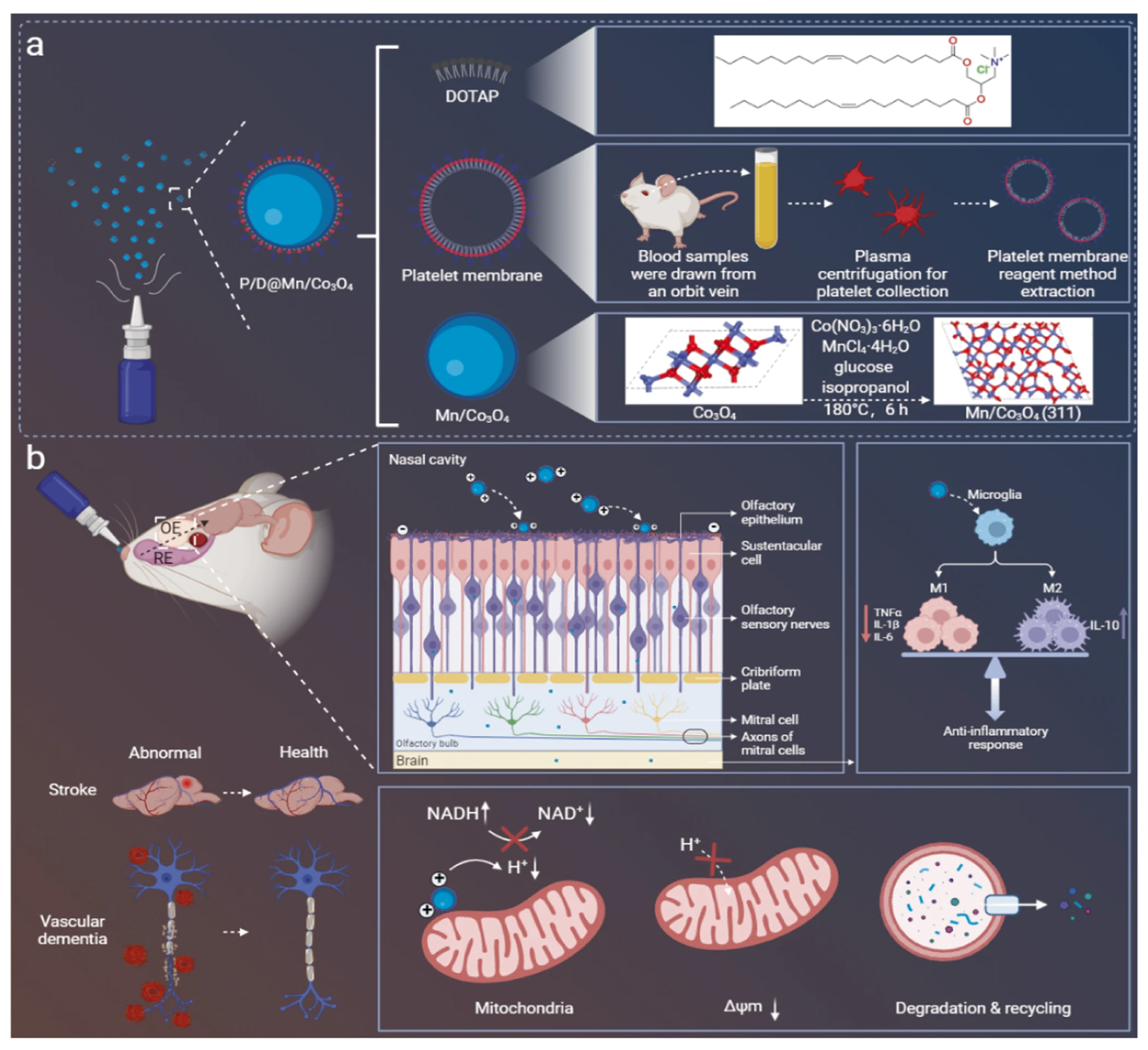 - Wang, D.; Li, B.; Wang, S.; Hao, Y.; Wang, H.; Sun, W.; Cao, J.; Zhou, X.; Zheng, B. Engineered Inhaled Nanocatalytic Therapy for Ischemic Cerebrovascular Disease by Inducing Autophagy of Abnormal Mitochondria. npj Regen. Med. 2023, 8, 44. [Google Scholar] [CrossRef]