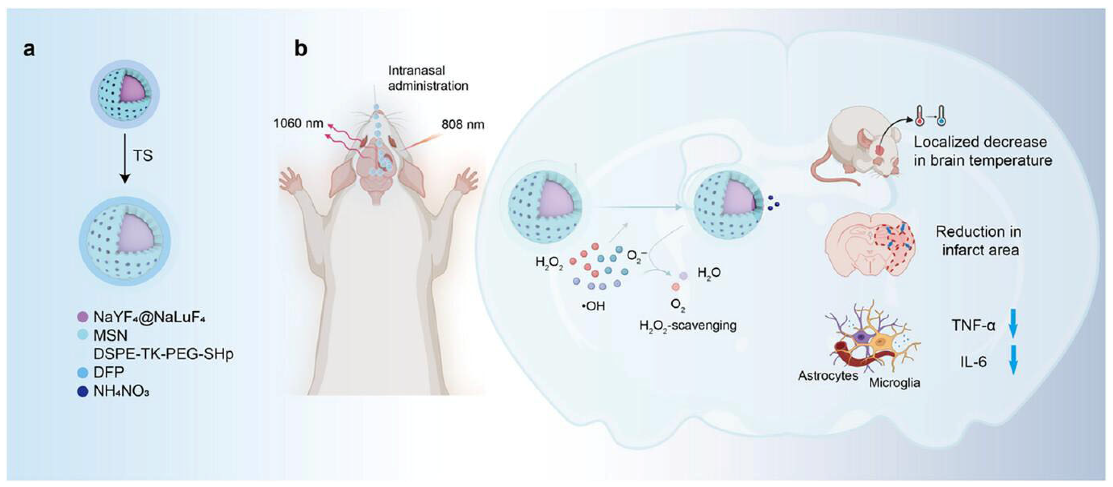 - Wang, P.; Zhang, C.; Meng, L.; Xu, S.; Zhang, J.; Wang, H.; Liang, H.-B.; Wang, W.-K.; Liu, J.-R.; Zhu, X. NIR-II Emissive, Ischemia Targeted Nanocomposites for Localized Therapeutic Hypothermia of Cerebral Ischemia-Reperfusion Injury. Small 2025, 21, e05141. [Google Scholar] [CrossRef]