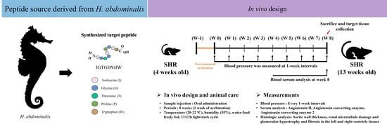 - Lee, H.G.; Kim, H.S.; An, H.; Baek, K.; Lee, J.M.; Yim, M.J.; Ko, S.C.; Kim, J.Y.; Oh, G.W.; Je, J.G.; et al. Antihypertensive Effects of IGTGIPGIW Peptide Purified from Hippocampus Abdominalis: P-ENOS and p-AKT Stimulation in EA.Hy926 Cells and Lowering of Blood Pressure in SHR Model. Mar. Drugs 2022, 20, 354. [Google Scholar] [CrossRef]
