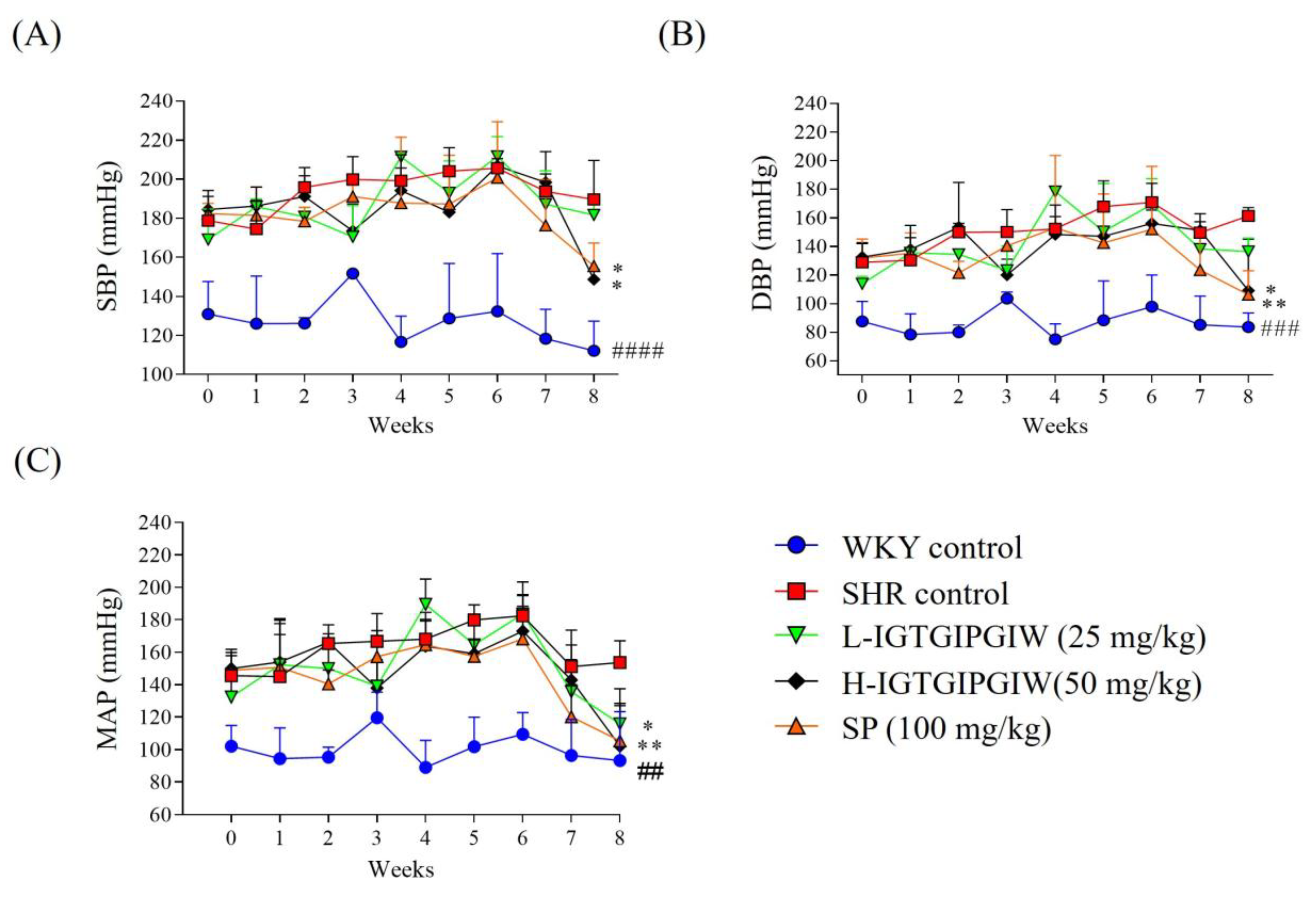 3.1. Blood Pressure Regulatory Effect of Long-Term IGTGIPGIW Administration in SHR