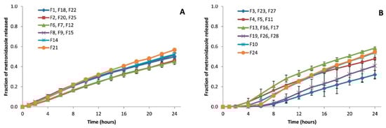 Dissolution profiles of metronidazole from sustained-release hydrophilic matrices at 7.2 buffering media. (A) Batches coated with Eudragit® RL 30D (time-dependent coating); (B) batches coated with Eudragit® FS 30D (pH-dependent coating) []. Reproduced with permission.