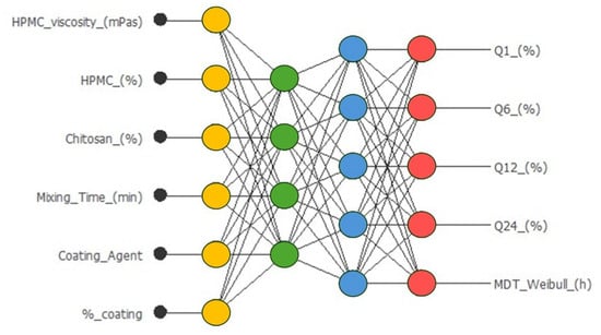 The architecture of the optimized neural network for metronidazole-coated matrices is shown in Figure 3.