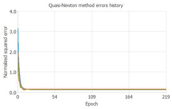 Once the architecture was defined, the artificial neural network was trained using a quasi-Newton iterative method, designed to minimize the overall error of the network. The training error was considered as the error of the AAN computed on the training dataset, and the selection error was considered as the error computed on a validation dataset. During training, both the training error and the selection error were continuously monitored in each iteration.