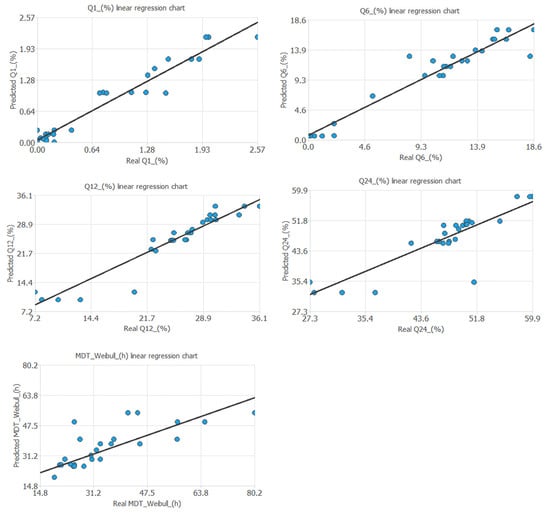 Table 2 and Figure 7 show the mathematical equations and the linear relationship established between the experimental and predicted values of the different output variables included in the artificial neural network. Figure 8 shows the linear relationship between the percentages of metronidazole dissolved at different times and the values predicted by the neural network.