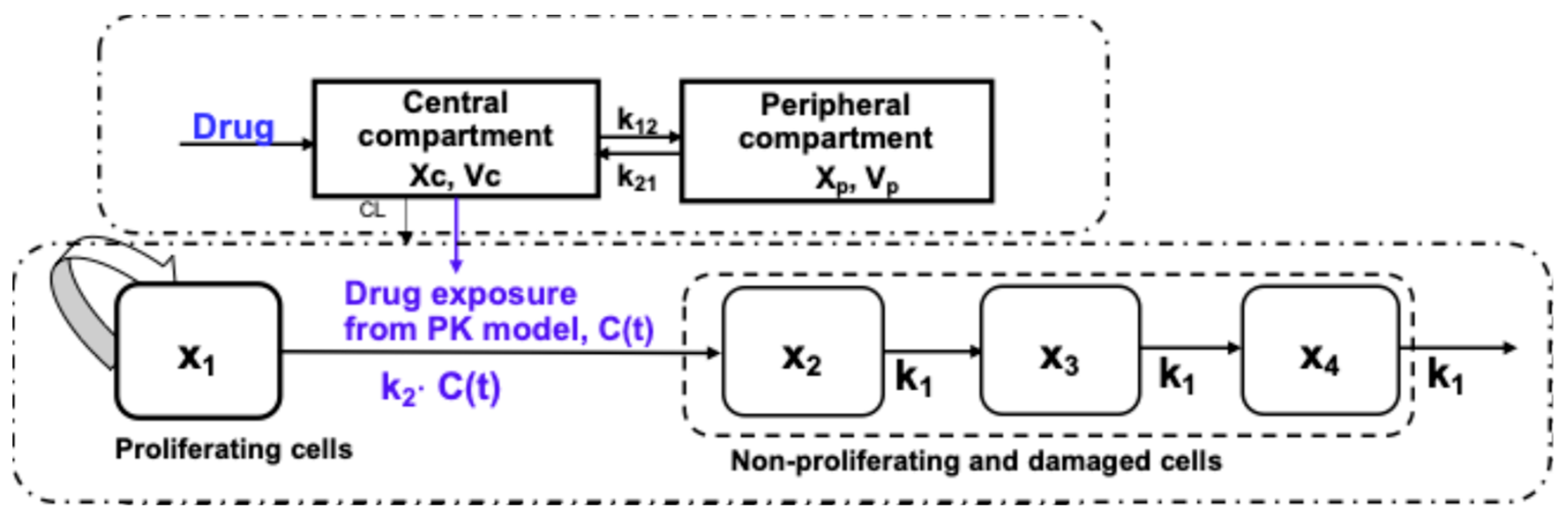 k1—the transient rate constant k2—the potency of the drug λ0—the exponential rate of tumor growth λ1—the linear rate of tumor growth —the shape parameter controls the nonlinearity and smoothness of the tumor growth function x1—the mass of the proliferating cells x2, x3, x4—the mass of the non-proliferating cells at different damage stages —the total tumor mass at time t —the plasma concentration of the drug at time t | ||