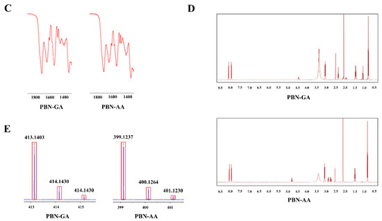 To impose colon-specificity on PBN, the amino groups in the acidic amino acids GA and AA were conjugated with the carboxylic group in PBN. The synthetic scheme and the proposed colonic activation of the conjugates are shown in Figure 1A,B. The synthesis of the final products, PBN-GA and PBN-AA, was verified by instrumental analysis using FT-IR, 1H-NMR, and mass spectrometry. As shown in Figure 1C, the amide bonds formed by the conjugation of PBN and amino acids were observed at 1639 cm−1 (for PBN-GA) and 1643 cm−1 (for PBN-AA). In 1H-NMR spectra, proton peaks ascribed to amino acids and PBN were clearly detected (Figure 1D). Mass spectrometry revealed molecular peaks corresponding to PBN-GA and PBN-AA (Figure 1E). The original spectra are shown in Supplementary Material S4.