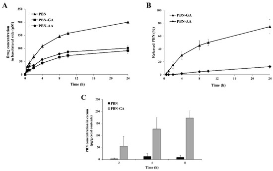 Distribution coefficients (log D6.8) of PBN, PBN-GA, and PBN-AA were measured using an isotonic phosphate buffer (pH 6.8)/n-octanol system, as described previously [22].