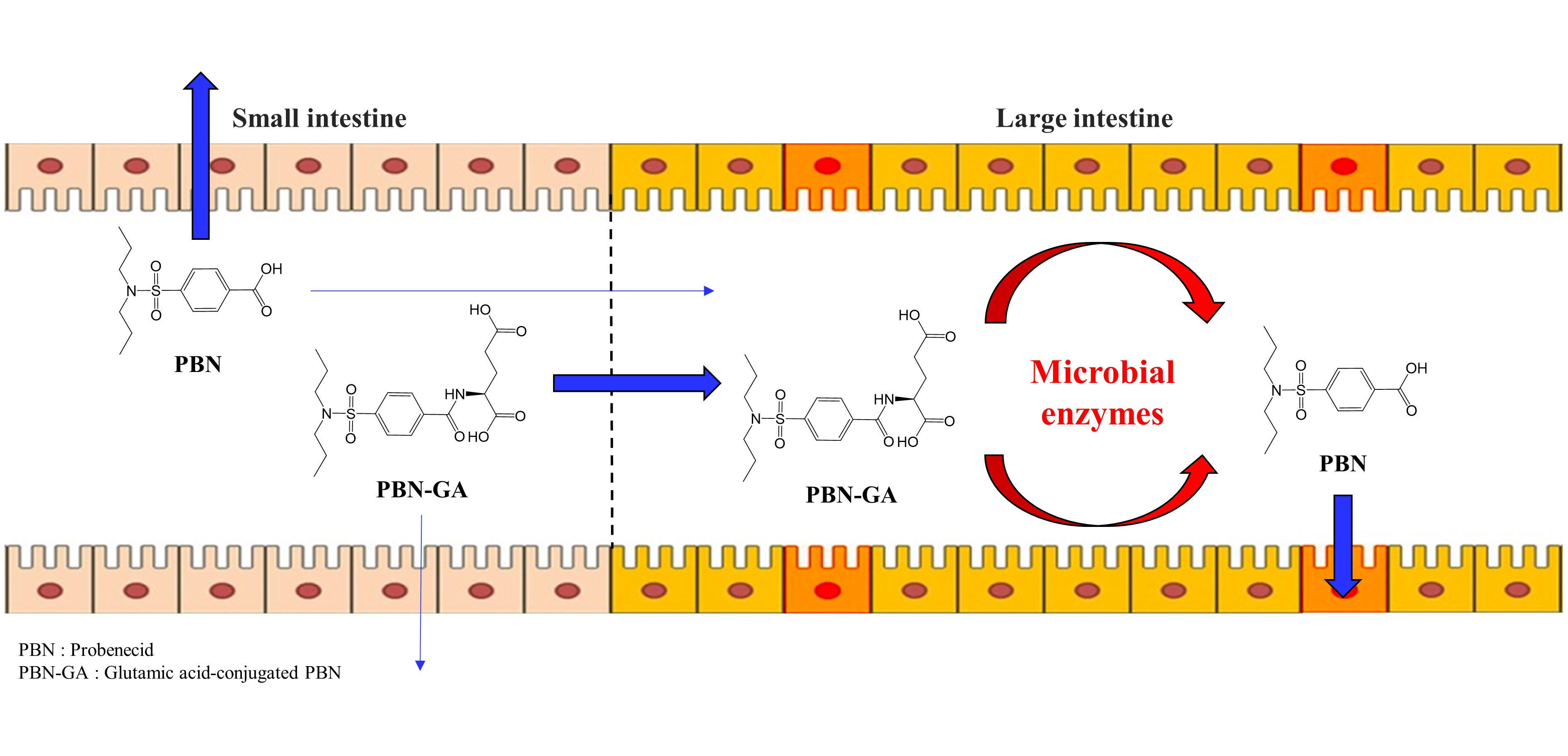 Background/Objectives: Probenecid (PBN) is a uricosuric agent that facilitates the excretion of uric acid and is used to treat gout. Here, a colon-targeted prodrug of PBN was designed to facilitate repositioning as a treatment for inflammatory bowel disease (IBD). Methods: The carboxylic group in PBN was amide-conjugated with the amine groups of acidic amino acids to yield aspartic acid-conjugated PBN (PBN-AA) and glutamic acid-conjugated PBN (PBN-GA). Conjugation with amino acids increased the hydrophilicity of PBN and decreased cell permeability across the Caco-2 cell monolayer. While remaining intact in buffers (pH 1.2, 6.8) and in the small intestinal contents of rats, the conjugates were cleaved to release PBN from the cecal contents of rats, with a significant difference in the maximal conversion percentage between PBN-AA (12%) and PBN-GA (74%). Results: Upon oral gavage, PBN-GA accumulated a much greater amount of PBN in the cecum than PBN alone, thus verifying the in vitro colon specificity of PBN-GA. Oral PBN-GA enhanced the anticolitis effectiveness in dinitrobenzene sulfonic acid-induced rat colitis and limited the systemic absorption of PBN, thus reducing the risk of systemic adverse effects ascribed to PBN. Moreover, PBN-GA therapeutically surpassed sulfasalazine, a currently used anti-IBD drug, in rat colitis. Conclusions: These results suggest that amide conjugation with GA can be used to design a colon-targeting prodrug for PBN. Colon-targeted PBN may not only enhance therapeutic effectiveness but also improve the safety of PBN repositioned for the treatment of IBD and may be a pharmacological alternative for current small-molecule anti-IBD drugs with low efficacy or serious adverse effects with long-term use.