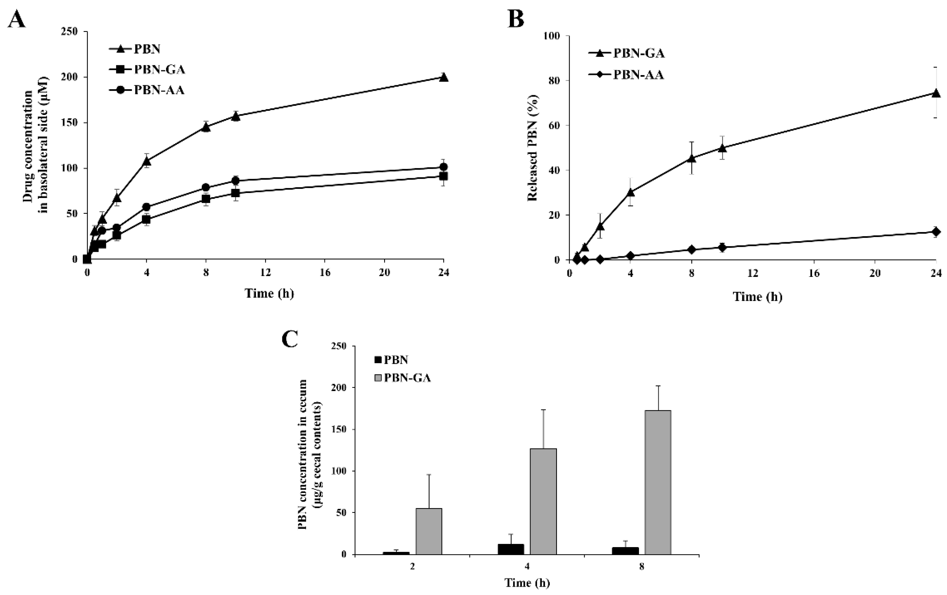 PBN derivatives are colon-specific prodrugs of PBN. (A) PBN and PBN derivatives (500 μM, 2.0 mL) dissolved in culture medium were applied to the apical side of the Caco-2 cell monolayer and incubated for 24 h. At predetermined time points, the concentrations of each compound in the basolateral compartment (3 mL) were quantified by HPLC. (B) PBN derivatives (2.0 mM) were incubated with the cecal contents suspended in isotonic phosphate buffer (pH 6.8, 10%) under nitrogen. The concentrations of PBN were analyzed using HPLC at appropriate time intervals. (C) Male SpD rats (250–260 g) underwent a 24 h fast while water was provided ad libitum. Rats were treated orally with PBN (30.0 mg/kg) and PBN-GA (43.6 mg/kg, equivalent to 30.0 mg/kg of PBN) suspended in PBS. The rats were euthanized at 2, 4, and 8 h after administration, and concentrations of PBN in the cecum were quantified using HPLC. The data are presented as mean ± SD (n = 5).