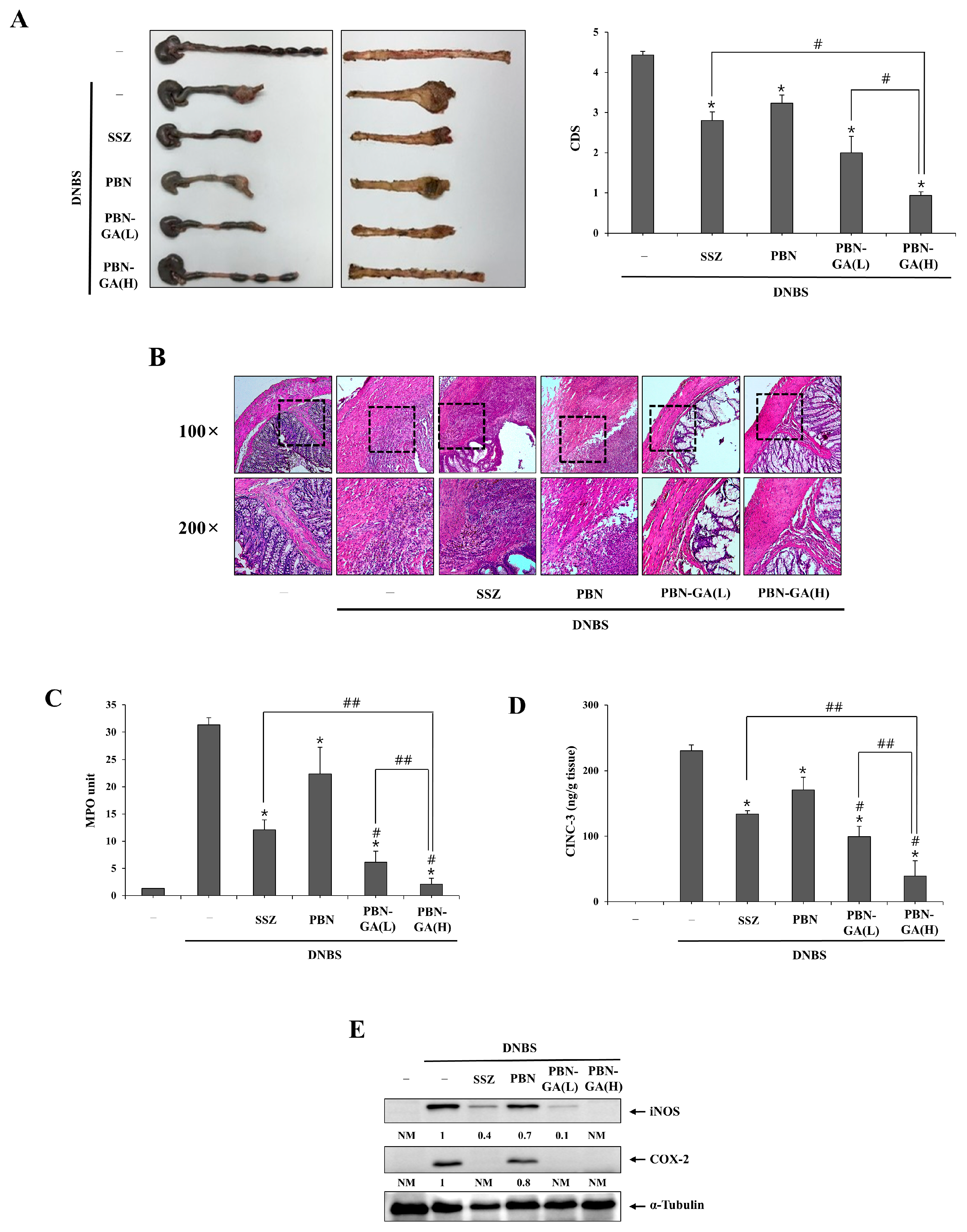 We examined whether the colon-targeted delivery of PBN exerted anticolitis effects in rat colitis and enhanced the anticolitis activity of PBN. In addition, the anticolitis efficacy of colon-targeted PBN was compared with that of SSZ, a colon-targeted prodrug of 5-ASA. Rat colitis was induced by rectal instillation of DNBS via oral gavage 3 days after colitis induction. Doses of SSZ (50.0 mg/kg) and PBN (30.0 mg/kg) were decided based on previous papers [30,31] and human doses (500.0 mg–2000.0 mg/day) for clinical uses [32,33], respectively. PBN (30.0 mg/kg), PBN-GA (21.8 mg/kg, equivalent to 15.0 mg/kg of PBN), PBN-GA (43.6 mg/kg, equivalent to 30.0 mg/kg of PBN), and SSZ (50.0 mg/kg) were administered orally to rats once per day for 6 consecutive days. The rats were sacrificed 24 h after the last dose, and the anticolitis effects of the drugs were evaluated. As shown in Figure 3A, the colitis control without medication showed severe colonic tissue damage due to inflammation, with hemorrhagic ulcers, extensive defoliation of the mucosa, stricture, edema, and adhesion to neighboring organs, along with shortening of the large intestine, which corresponded to approximately a 4.5 CDS. All drugs showed anticolitis activity, with alleviated colonic tissue damage and inflammation. The colonic tissue improvement was greater with PBN-GA than with PBN, regardless of the dose. In addition, PBN-GA at low and high doses was more effective than SSZ in alleviating colonic tissue damage. Hematoxylin and eosin (H&E) staining of the inflamed colon showed that mucosal recovery with PBN-GA occurred in a dose-dependent manner and was more effective than PBN and SSZ (Figure 3B). As shown in Figure 3C–E, colonic inflammation was attenuated by all drugs. PBN-GA dose-dependently diminished myeloperoxidase (MPO) activity (Figure 3C) and the levels of inflammatory mediators, COX-2, iNOS (Figure 3E), and CINC-3 (Figure 3D), and was more effective in suppressing the inflammatory response than PBN and SSZ, regardless of the dose of PBN-GA. These results indicate that colon-targeted PBN potentiates the anticolitis activity of PBN and therapeutically surpasses SSZ in rat colitis. Original images of Western blot and bar graphs presenting quantified image intensity as mean ± SD are shown in Supplementary Material S5.