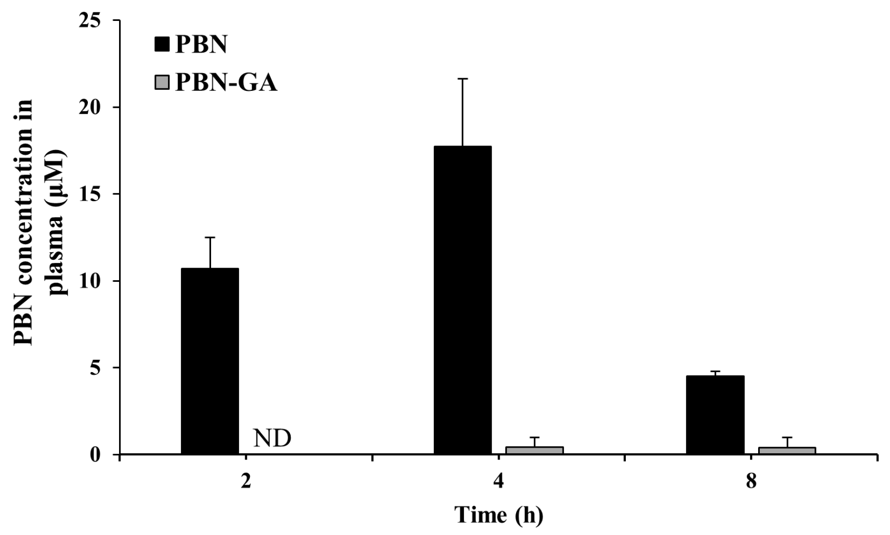 With drug repositioning, the original effect of a candidate drug becomes an adverse effect. Therefore, the repurposing of oncologic drugs for non-oncological use is not recommended. Moreover, it would be beneficial to minimize the original pharmacological activity of repositioned drugs, even for non-oncological drugs. To evaluate whether colon-targeted PBN can have improved safety with repositioning as an anti-IBD drug, concentrations of PBN were monitored in the blood at 2, 4, and 8 h after oral gavage of PBN (100.0 mg/kg) and PBN-GA (145.4 mg/kg equivalent to 100.0 mg/kg of PBN). As shown in Figure 4, oral PBN-GA had greatly reduced blood concentrations of PBN at all time points compared with oral PBN (1.4 μM–3.7 μM). The peak blood concentration of PBN obtained after oral administration of PBN-GA was lowered to approximately 1/45 of that obtained after the oral administration of PBN.