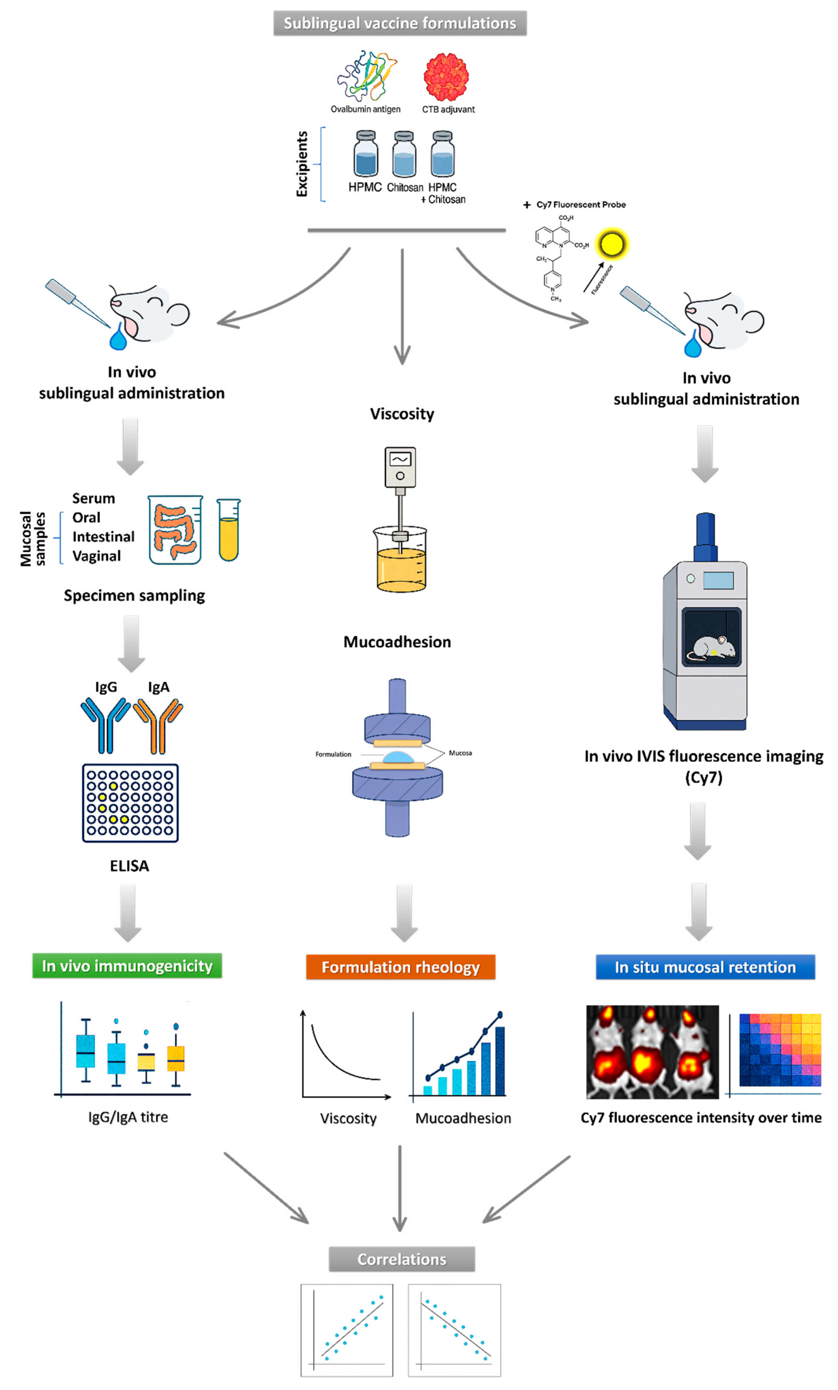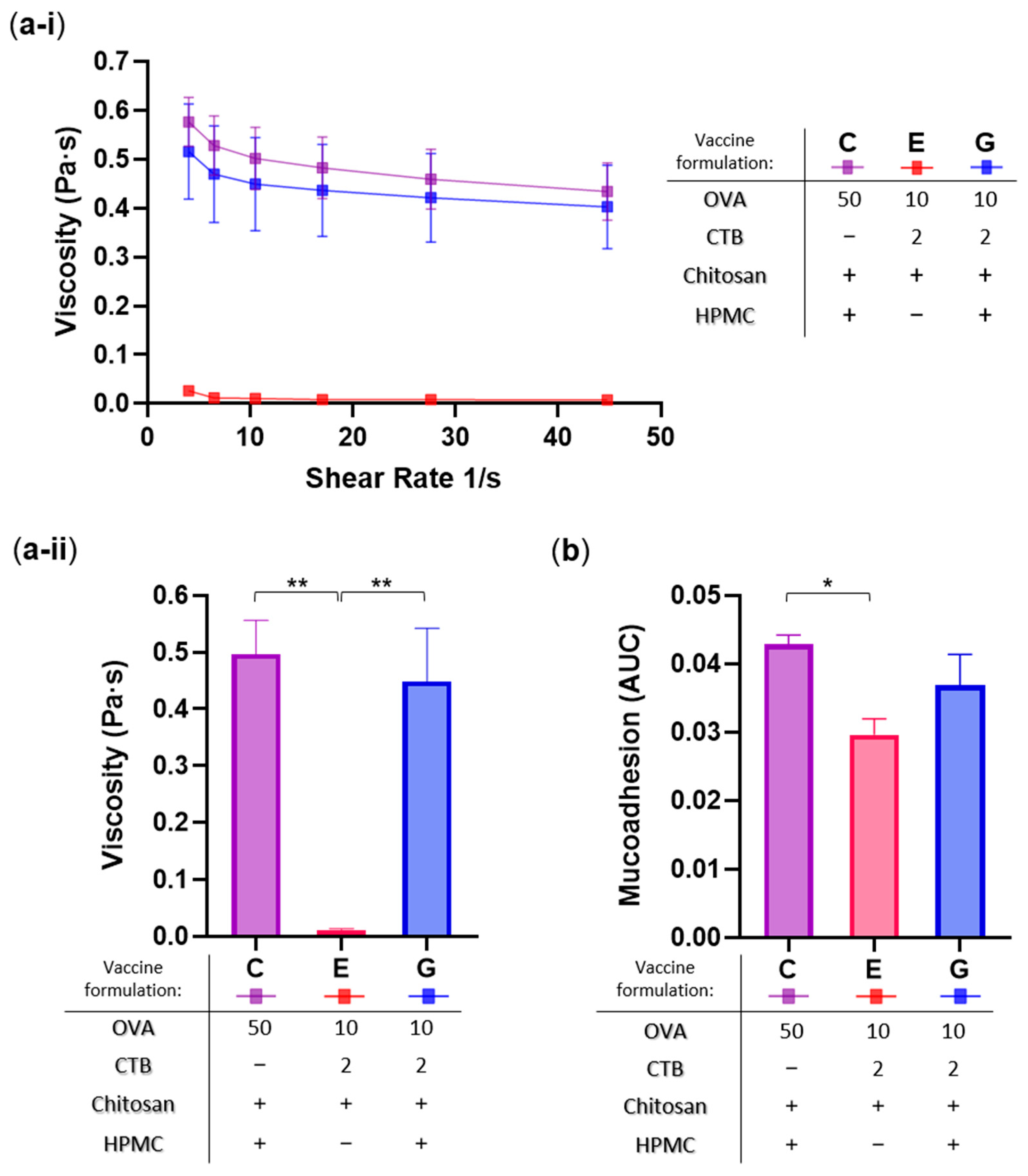 | Formulation | OVA (µg) | CTB (µg) | MGC (µg) | HPMC (w/v %) | Immunogenicity | Sublingual Residence | Viscosity & Mucoadhesion |