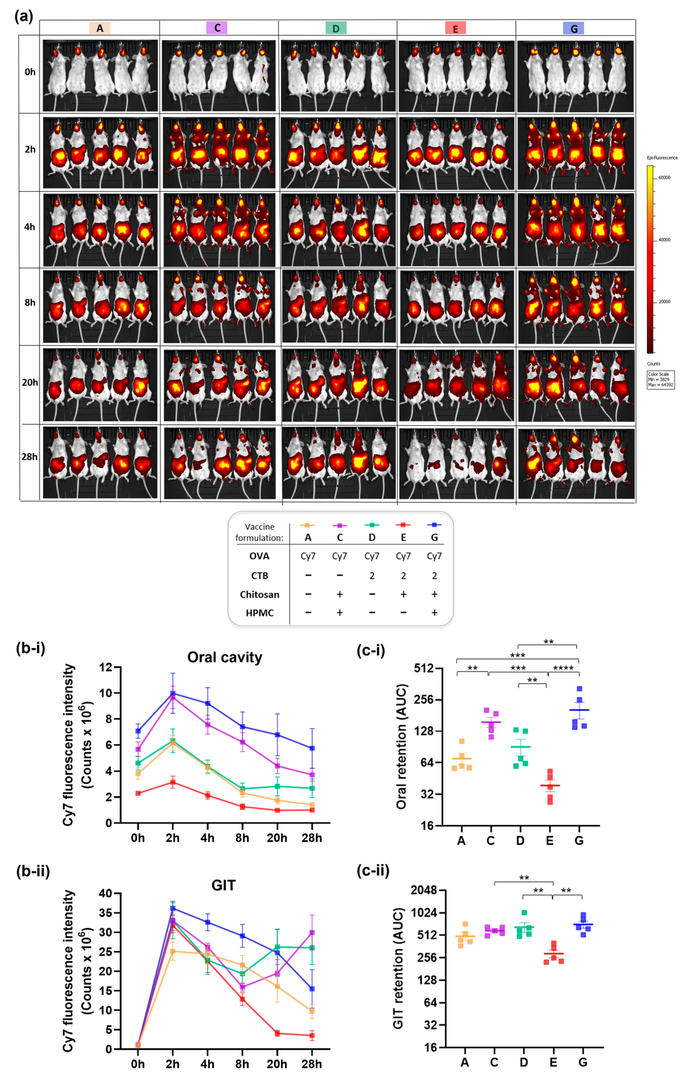 2.5. In Vivo Imaging of Mucosal In Situ Residence and Its Spatiotemporal Clearance Kinetics Using IVIS