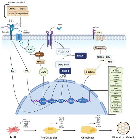 Cellular mechanisms underlying osteogenesis. Bone morphogenetic protein (BMP) signaling activates SMAD1/5/8, which associate with SMAD4 and translocates to the nucleus, while canonical Wnt/β-catenin signaling, mediated through LRP5/6 and Dishevelled, stabilizes β-catenin to promote transcriptional activity [,]. In parallel, mechanotransduction activate integrins and Ca2+ channels, initiating intracellular signaling cascades through Src, FAK, and MAPK pathways []. These converging pathways regulate key transcription factors, including RUNX2, Osterix, DLX5, MSX2, and TCF/LEF, which drive the expression of osteogenic genes such as ALP, collagen type I (COL1A1), osteocalcin (OCN [BGLAP]), and osteopontin (OPN [SPP1]) [,]. Together, these mechanisms coordinate matrix mineralization, angiogenesis, and osteoblast differentiation. The lower panel illustrates the stepwise progression from MSCs to pre-osteoblasts, mature osteoblasts, and ultimately mineralized osteoid, highlighting the integrated molecular and cellular processes essential for bone formation. Created in BioRender. Bergren, S. (2025) https://BioRender.com/qt1yy6z.