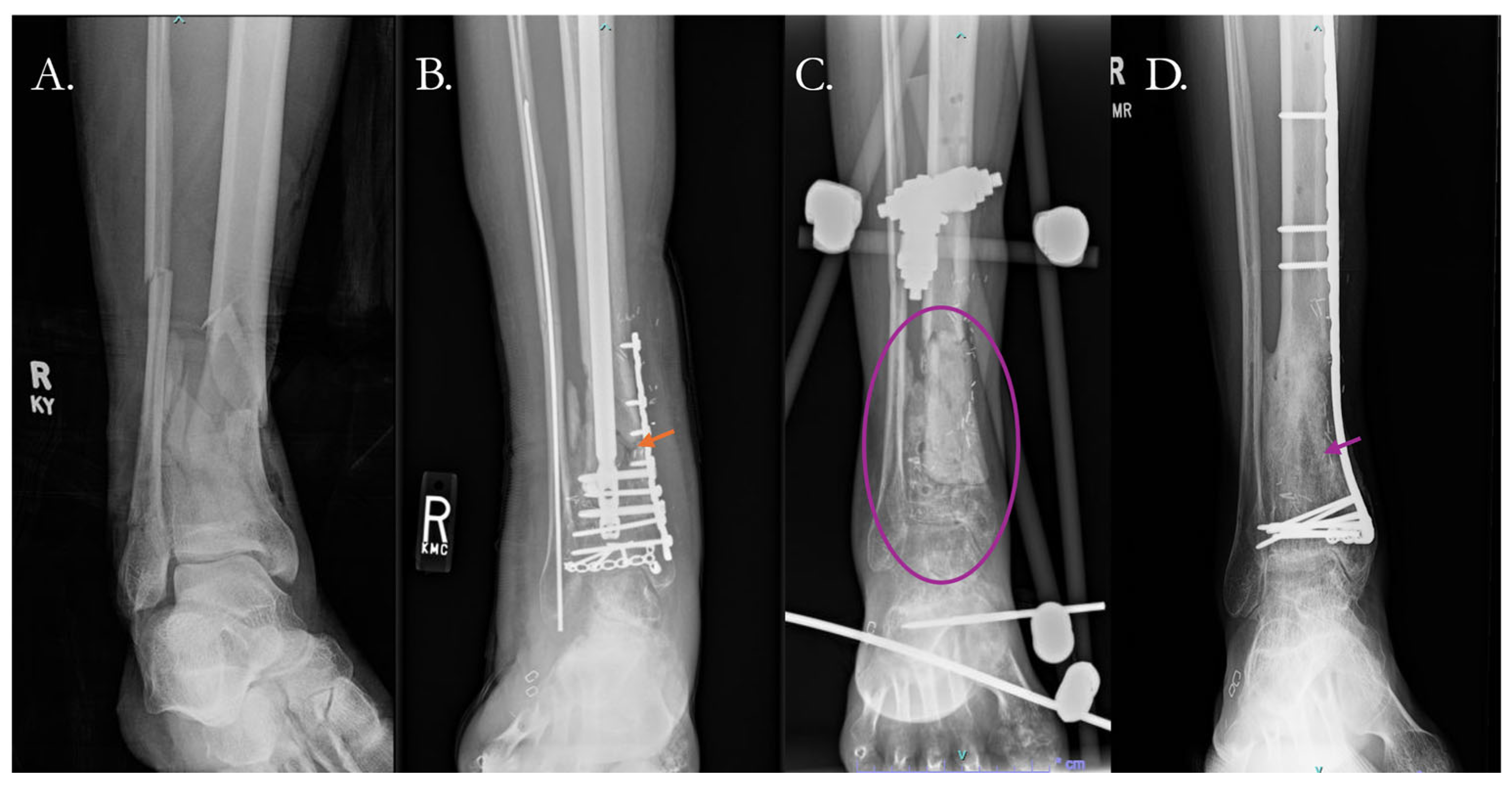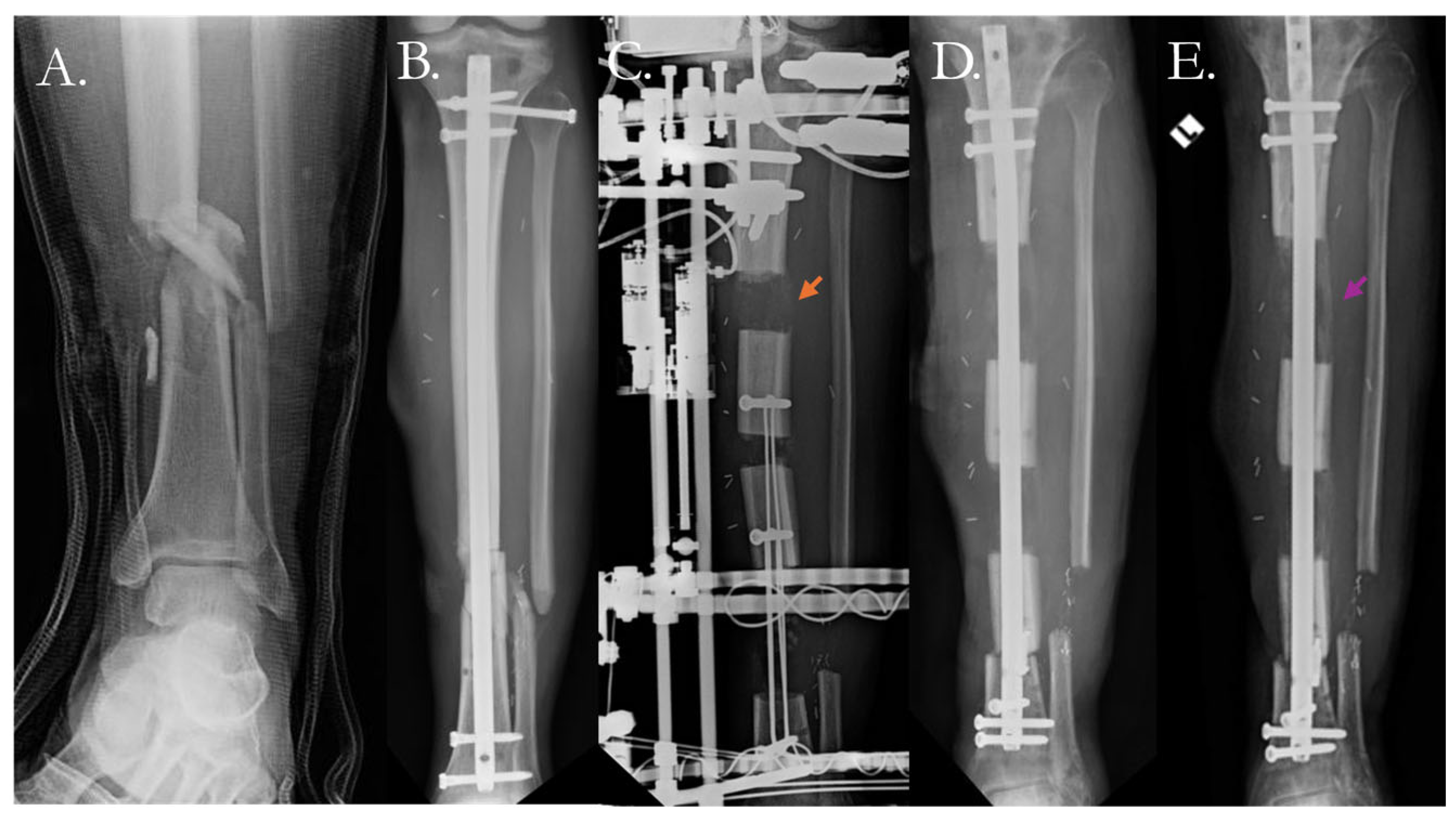 - Schnetz, M.; Wengert, A.; Ruckes, C.; Jakobi, T.; Klug, A.; Gramlich, Y. Open Fractures of the Lower Leg: Outcome and Risk-Factor Analysis for Fracture-Related Infection and Nonunion in a Single Center Analysis of 187 Fractures. Injury 2025, 56, 112303. [Google Scholar] [CrossRef]