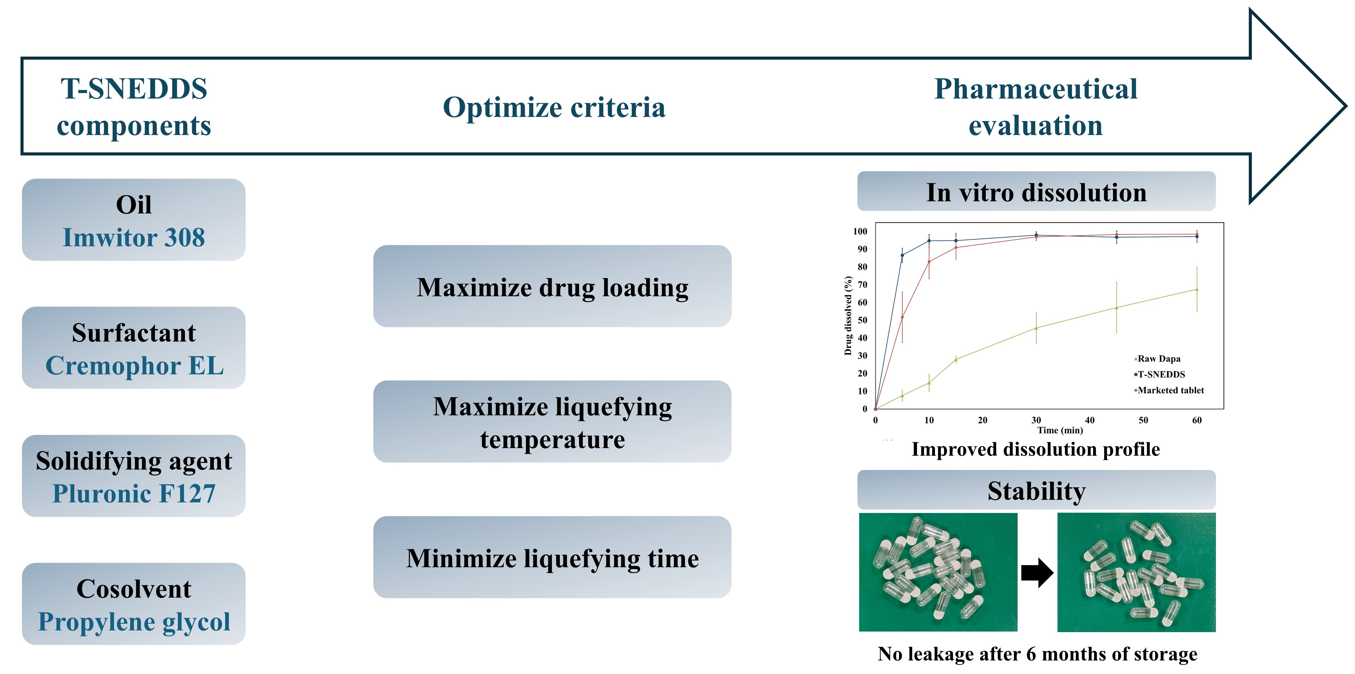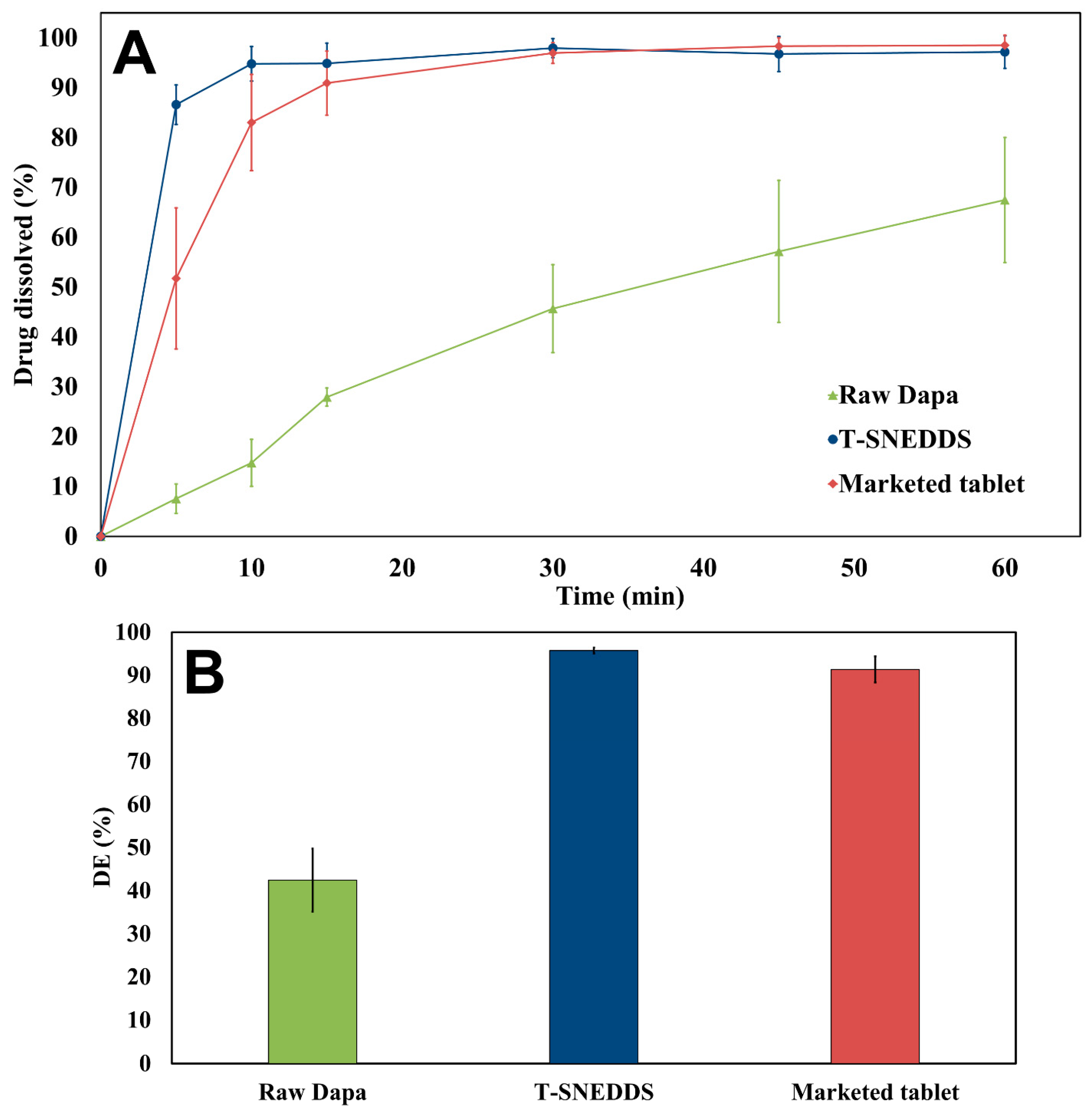The oil phase in the T-SNEDDS formulation was selected based on the measured solubility of dapagliflozin. This enhances drug solubilization within the GIT and provides a concentration gradient driving force to boost its bioavailability [