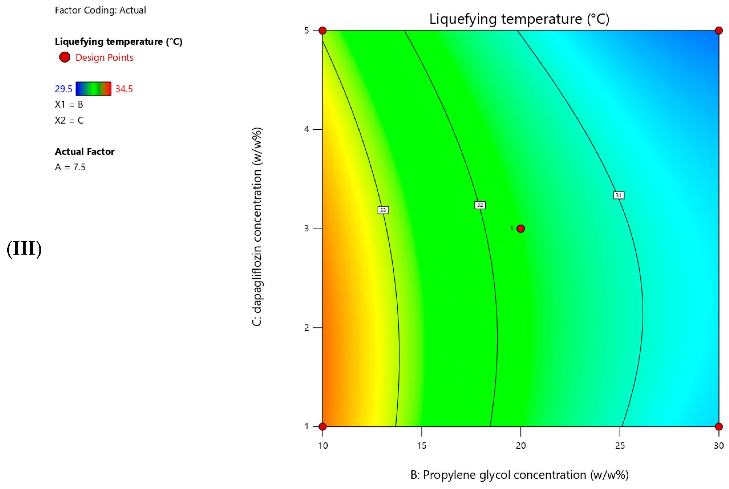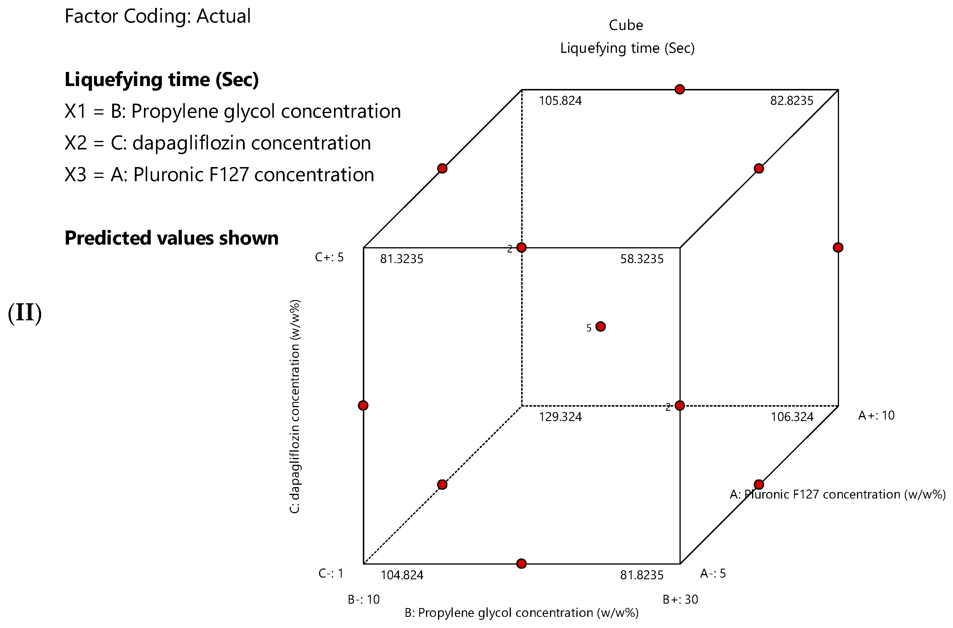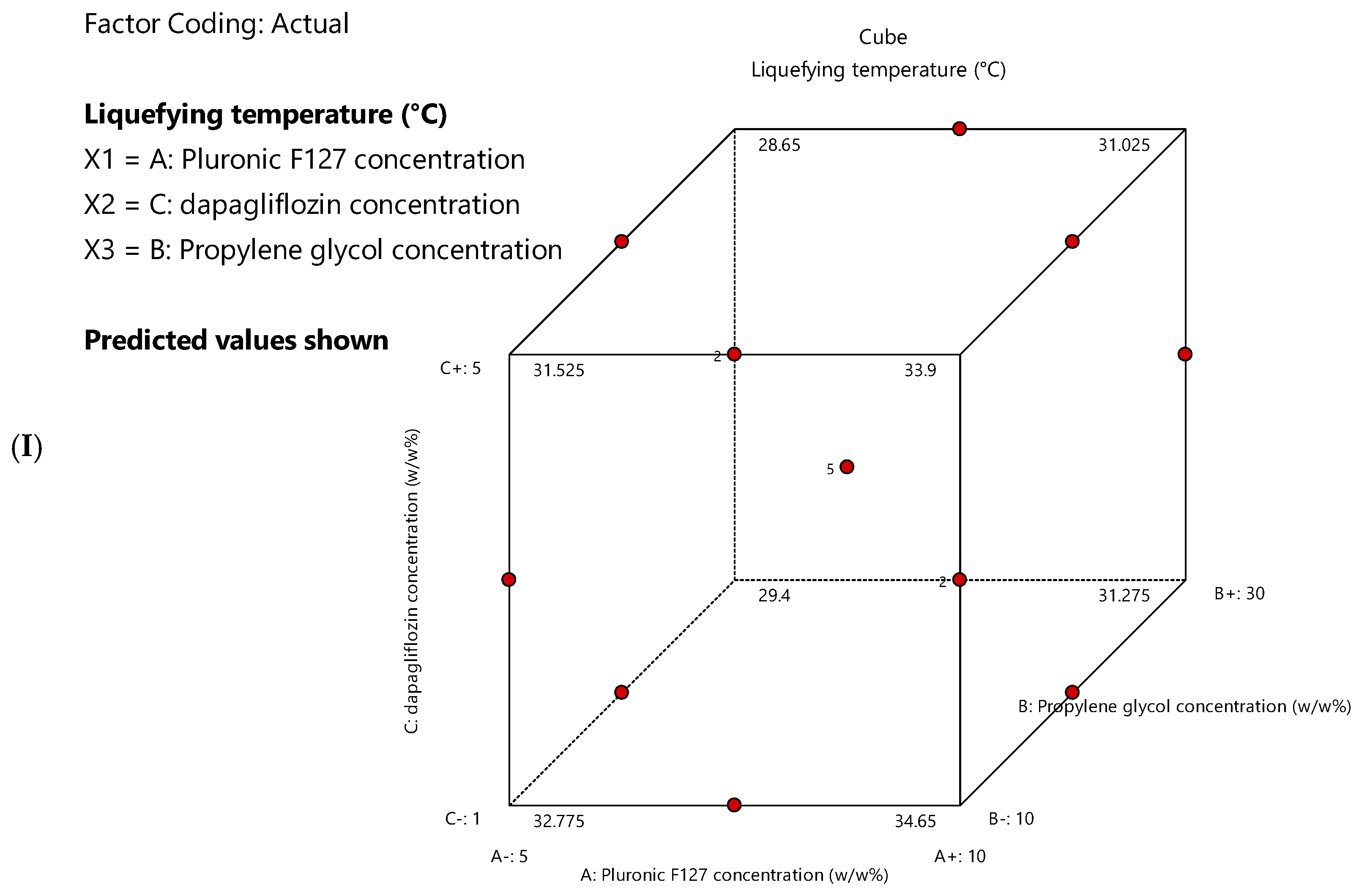 Table 6 and Equation (1)). Propylene glycol had the strongest effect on liquefying temperature indicated by large coefficient factor value (1.56), followed by pluronic F127 (1.06). However, dapagliflozin showed minor influence, indicated by the smallest coefficient factor value (0.38). Moreover, the sign of interaction terms between each pair of variables represents synergistic or antagonistic combined effects between them. Finally, the numerical coefficient values of the quadratic terms indicate both the magnitude and direction of each factor’s influence on liquefying temperature.