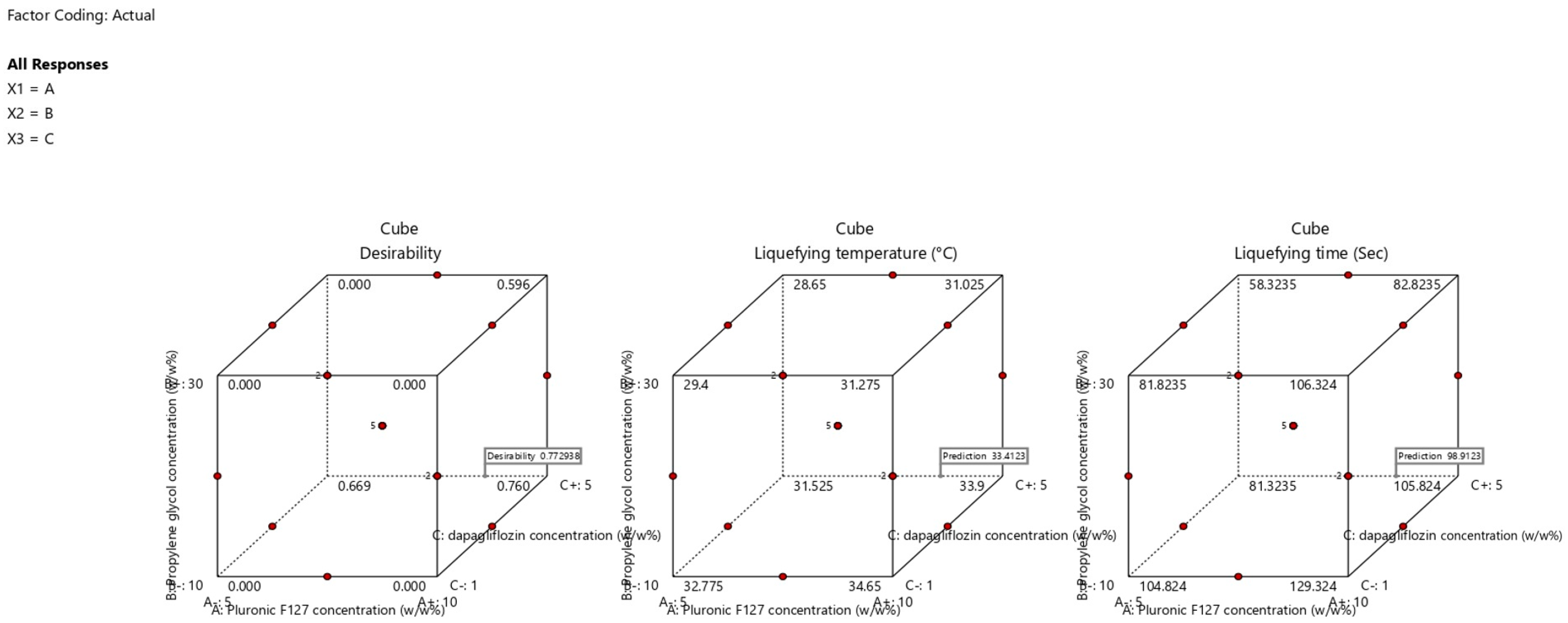 Three independent factors (pluronic F127 concentration, propylene glycol concentration, and dapagliflozin concentration) were selected to study their influence on the measured responses (liquifying temperature and liquifying time) using DoE software. Seventeen suggested formulations were prepared, and the actual measured response values are presented in