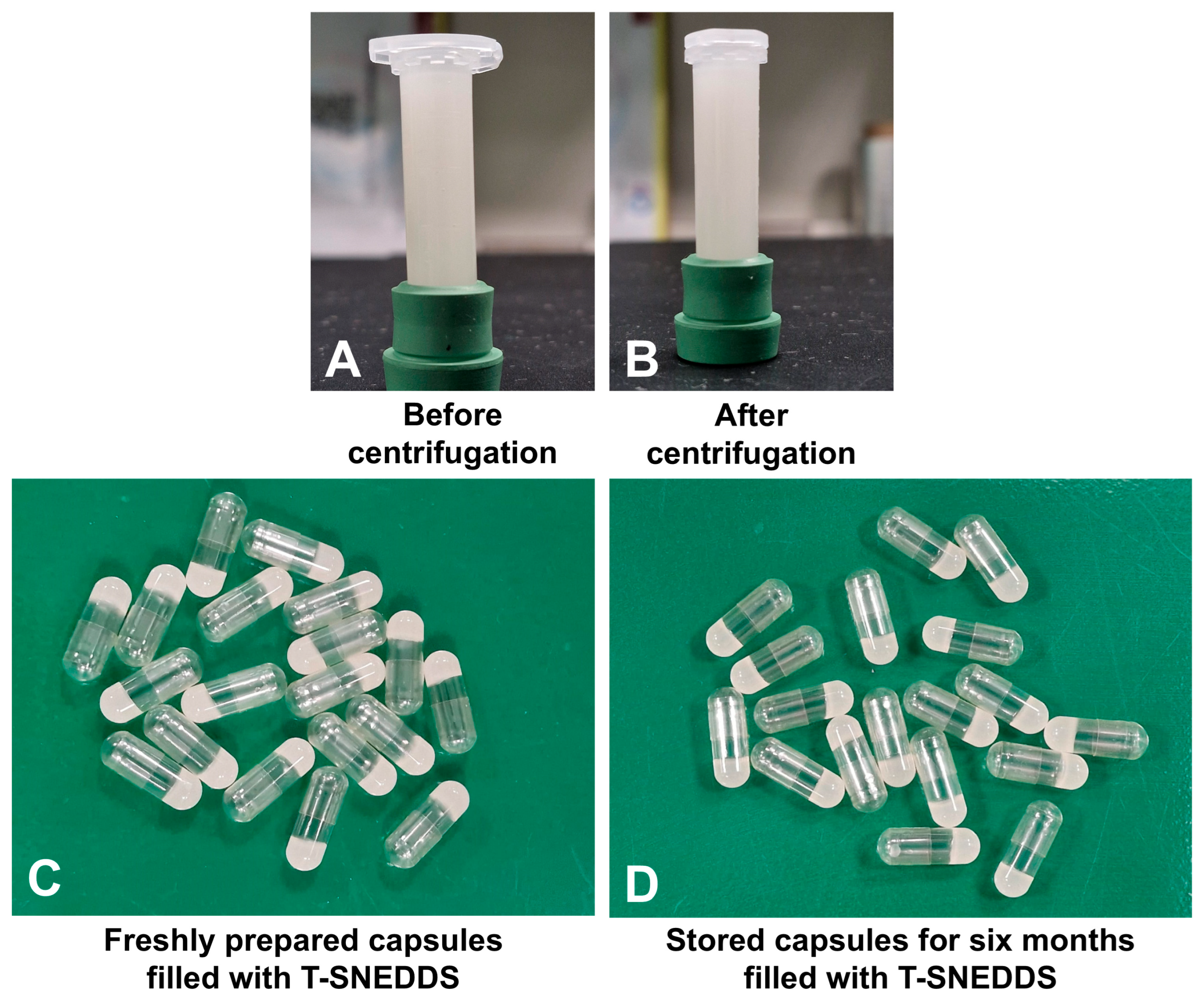 A stability study was conducted to evaluate the performance of T-SNEDDS under vigorous transportation conditions and assess the potential for leakage. For transportation assessment, T-SNEDDS was placed in a 2 mL Eppendorf tube and centrifuged at 5000 rpm for 30 min. After that, the formulation was examined for any sign of phase separation. For leakage assessment, T-SNEDDS was filled into a hard gelatin capsule, which provides a good model for assessing liquefaction tendency. The prepared capsules were stored for six months at room temperature to check for any signs of leakage.
