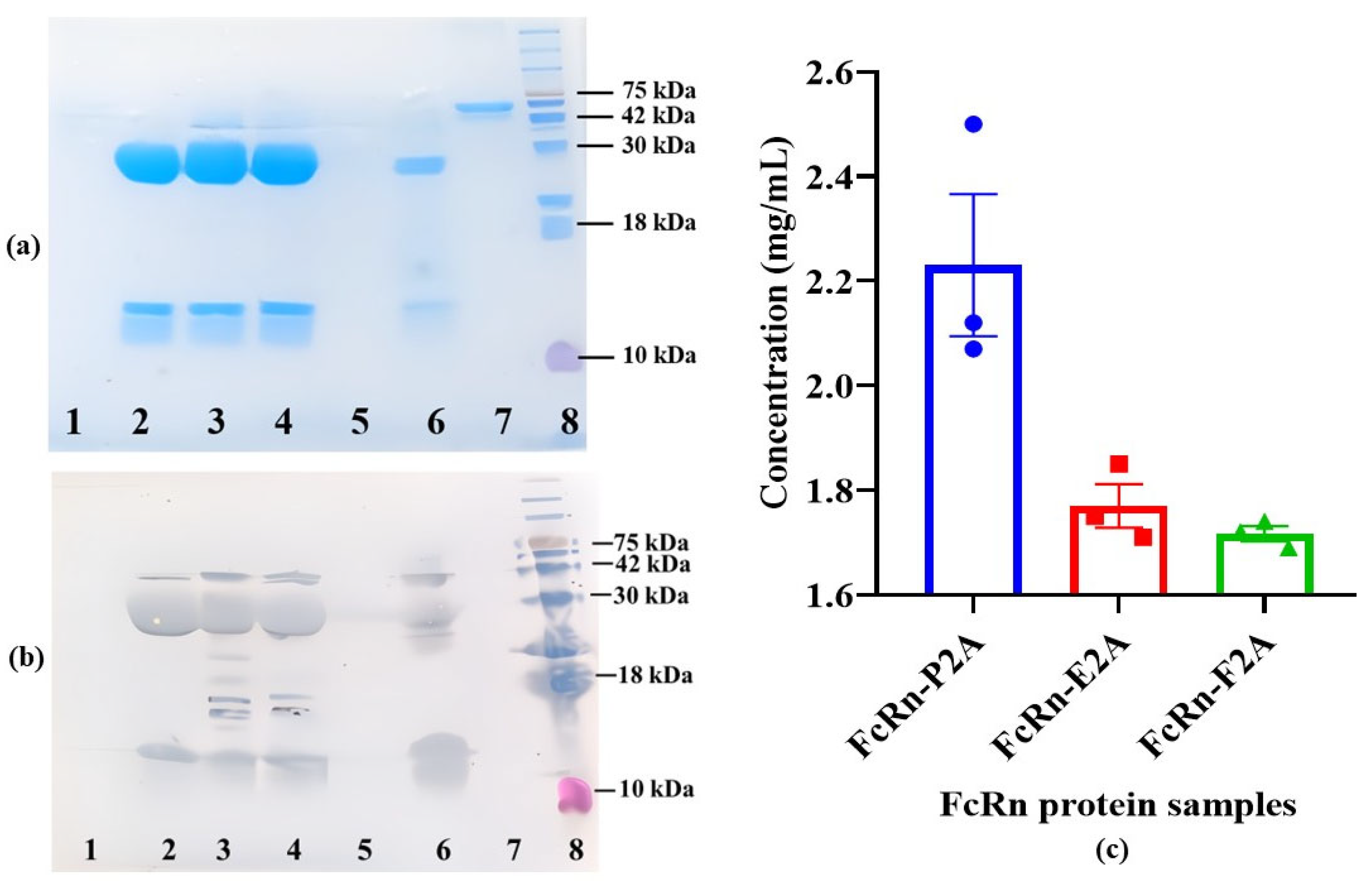 6 cells/mL) with high viability (95–98%). Cultivation was carried out for 12–13 days under standard conditions (37 °C), followed by a temperature shift to 31 °C to enhance protein expression. FcRn proteins were harvested from the culture supernatant and purified by Ni-NTA affinity chromatography. Elution was performed in PBS (pH 7.4) containing 300 mM imidazole. The purified samples (FcRn-P/L, FcRn-P2A, FcRn-E2A, FcRn-F2A, and FcRn-T2A) were analyzed by SDS–PAGE and Western blotting to assess molecular weight and subunit composition (