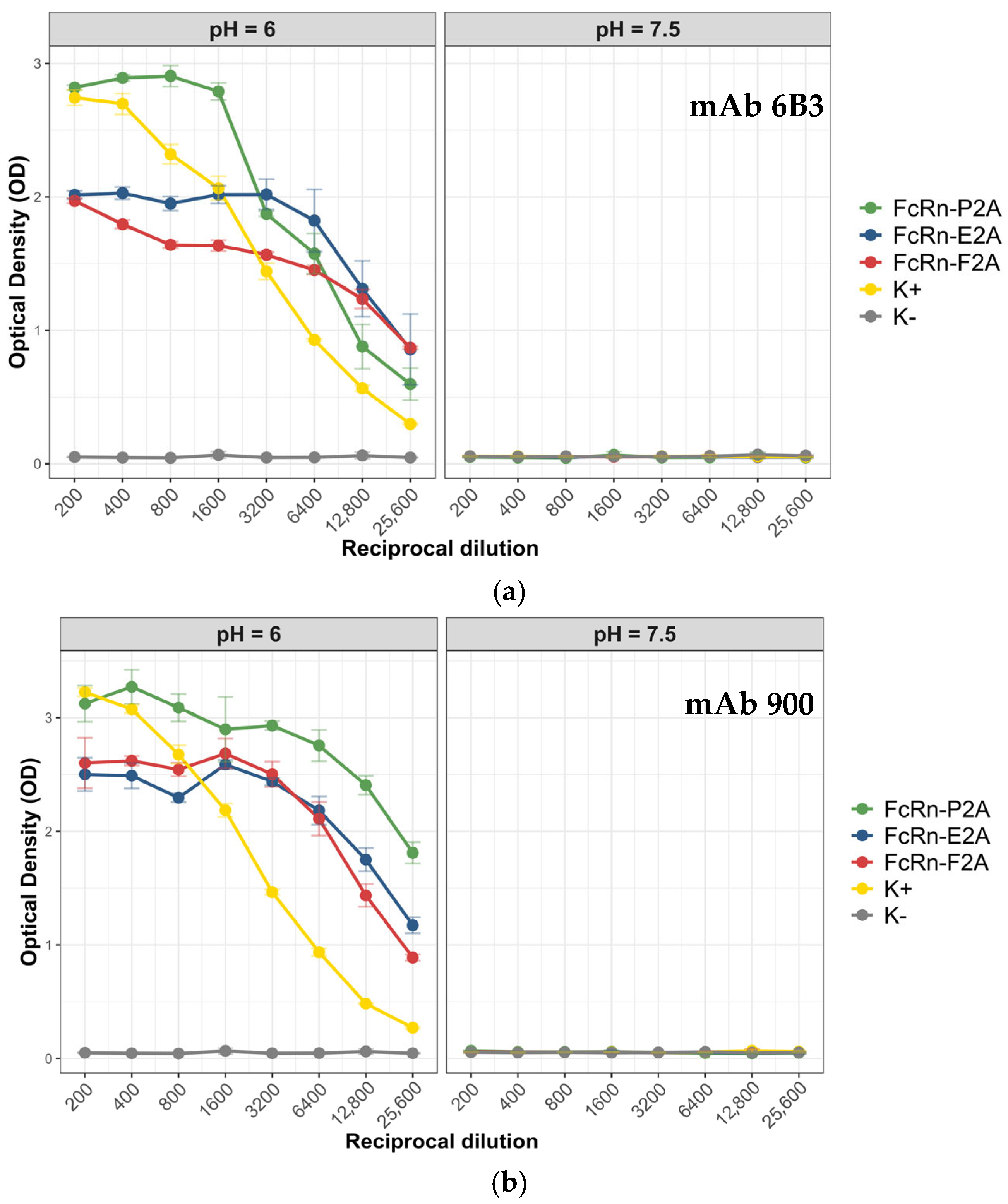 All tested FcRn variants (P2A, E2A, and F2A) demonstrated a pronounced pH-dependent binding pattern with both antibodies: strong binding was observed at pH 6.0, whereas the signal dropped to background levels at pH 7.5. The mean optical density (OD) values at neutral pH were close to background (0.05–0.06), indicating minimal nonspecific interaction. For antibody 6b3, the highest signal was observed for the FcRn-P2A variant (OD 2.8), whereas FcRn-E2A and FcRn-F2A showed lower binding levels (OD 1.9–2.0). A similar trend was noted for antibody 900: the FcRn-P2A variant exhibited the strongest binding (OD ~3.1), while FcRn-F2A and FcRn-E2A showed slightly reduced signals (OD 2.5–2.6).