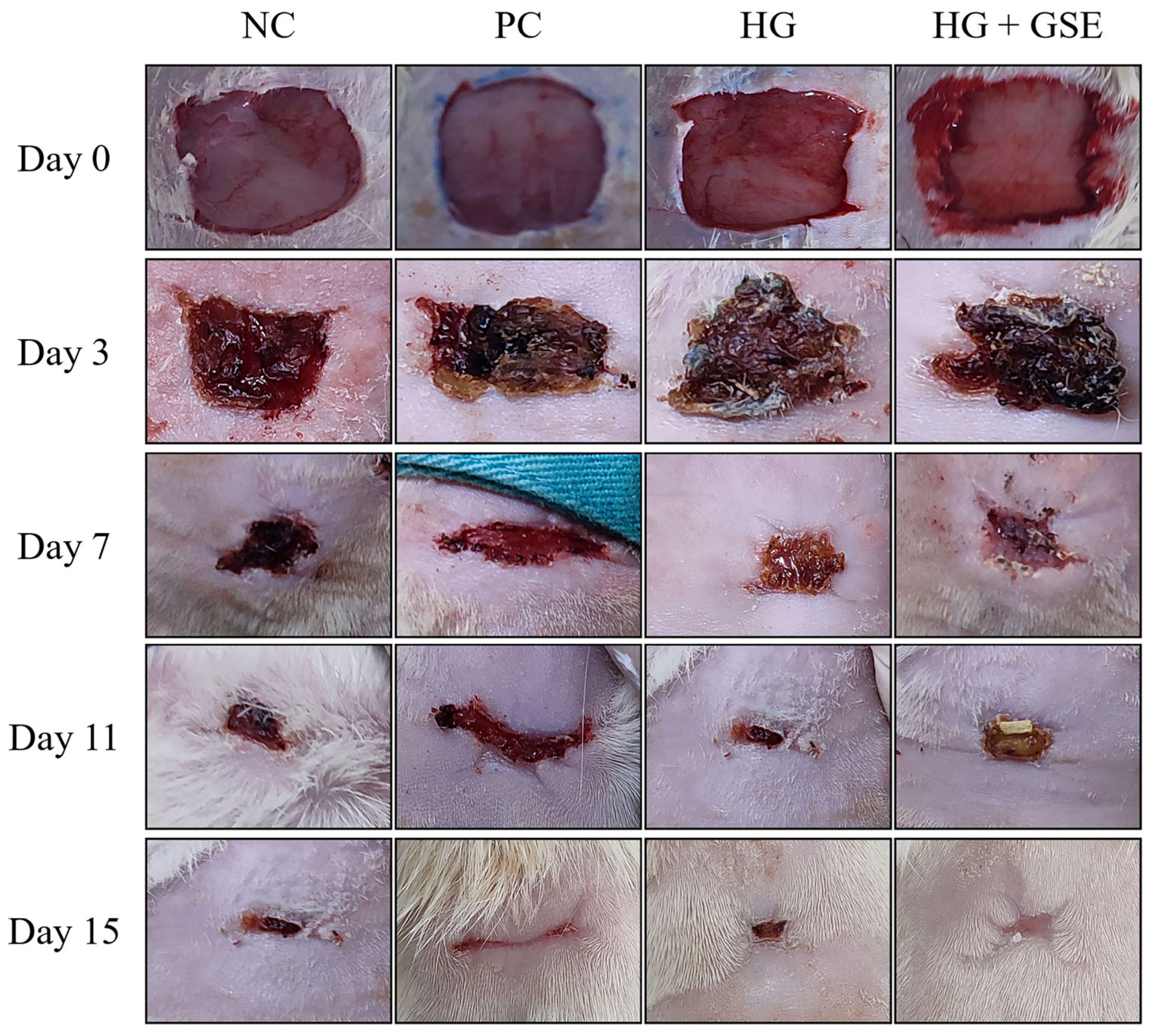 - Hydrogel base (HG)—included rats with wounds treated with a hydrogel without grape skin extract;