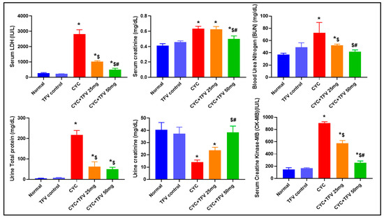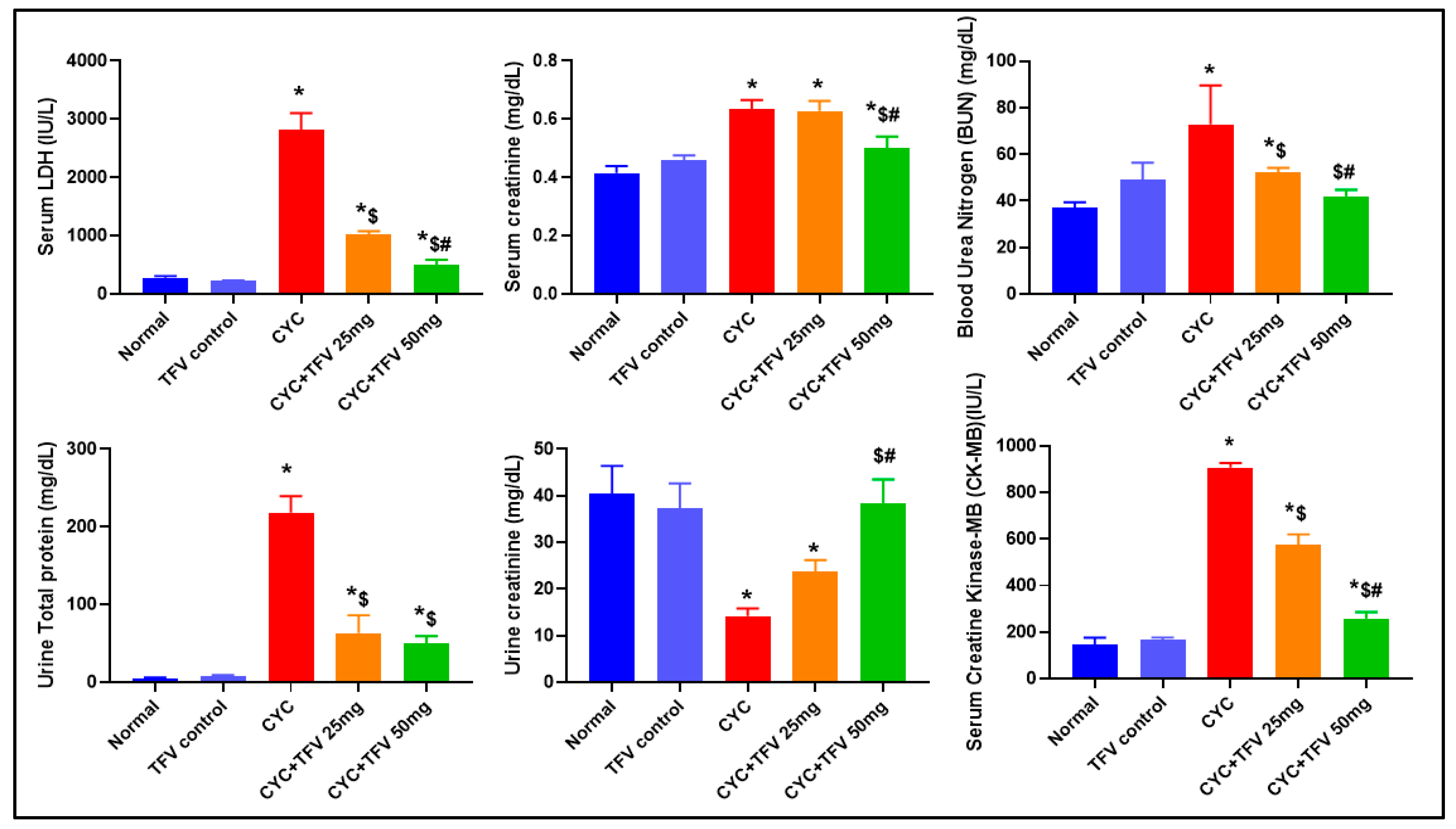 3.1. The Impact of TFV (TFV 25 and 50 mg/kg) on Serum LDH, CK-MB, Cr, and BUN Altered via CYC Injection