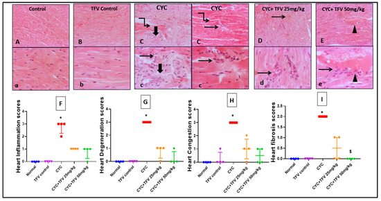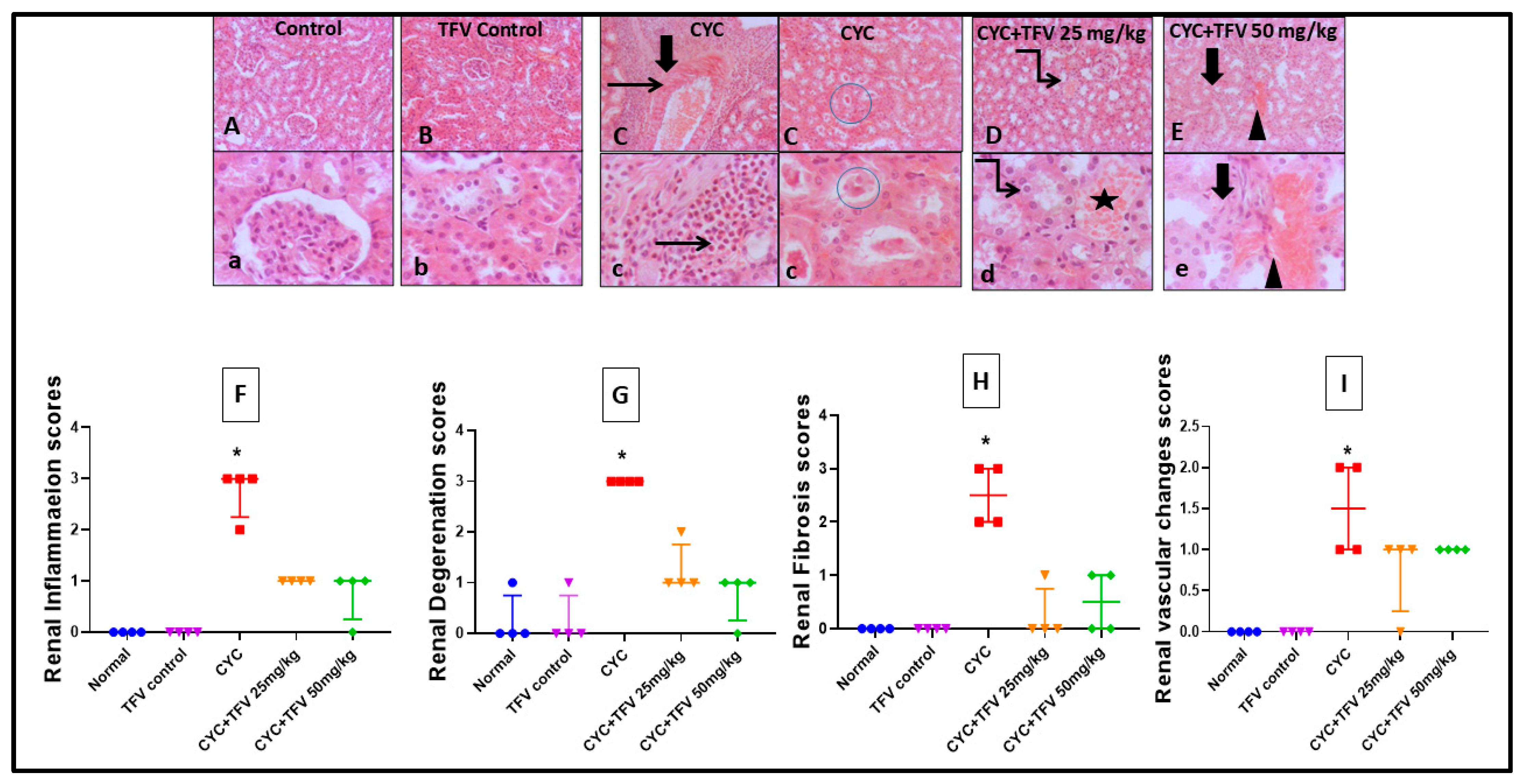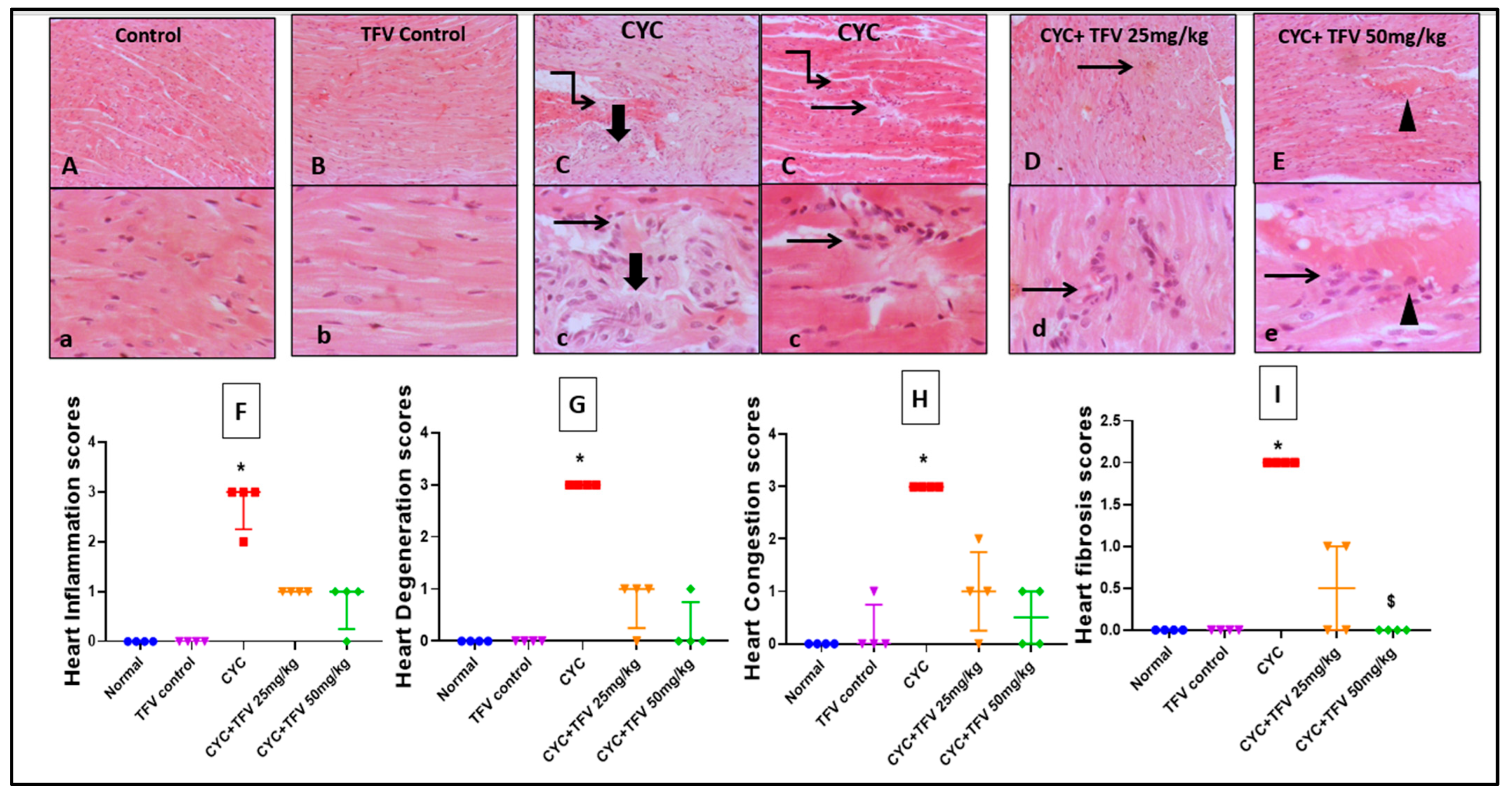 3.3. The Impact of TFV (TFV 25 and 50 mg/kg) on Renal and Cardiac Histopathology Alteration Caused by CYC