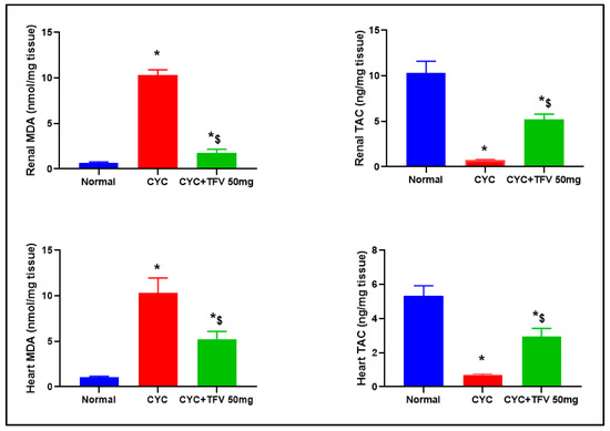 3.4. The Impact of TFV (50 mg/kg) on Renal and Cardiac MDA and TAC Altered via CYC Injection