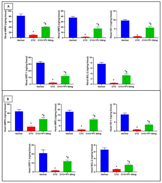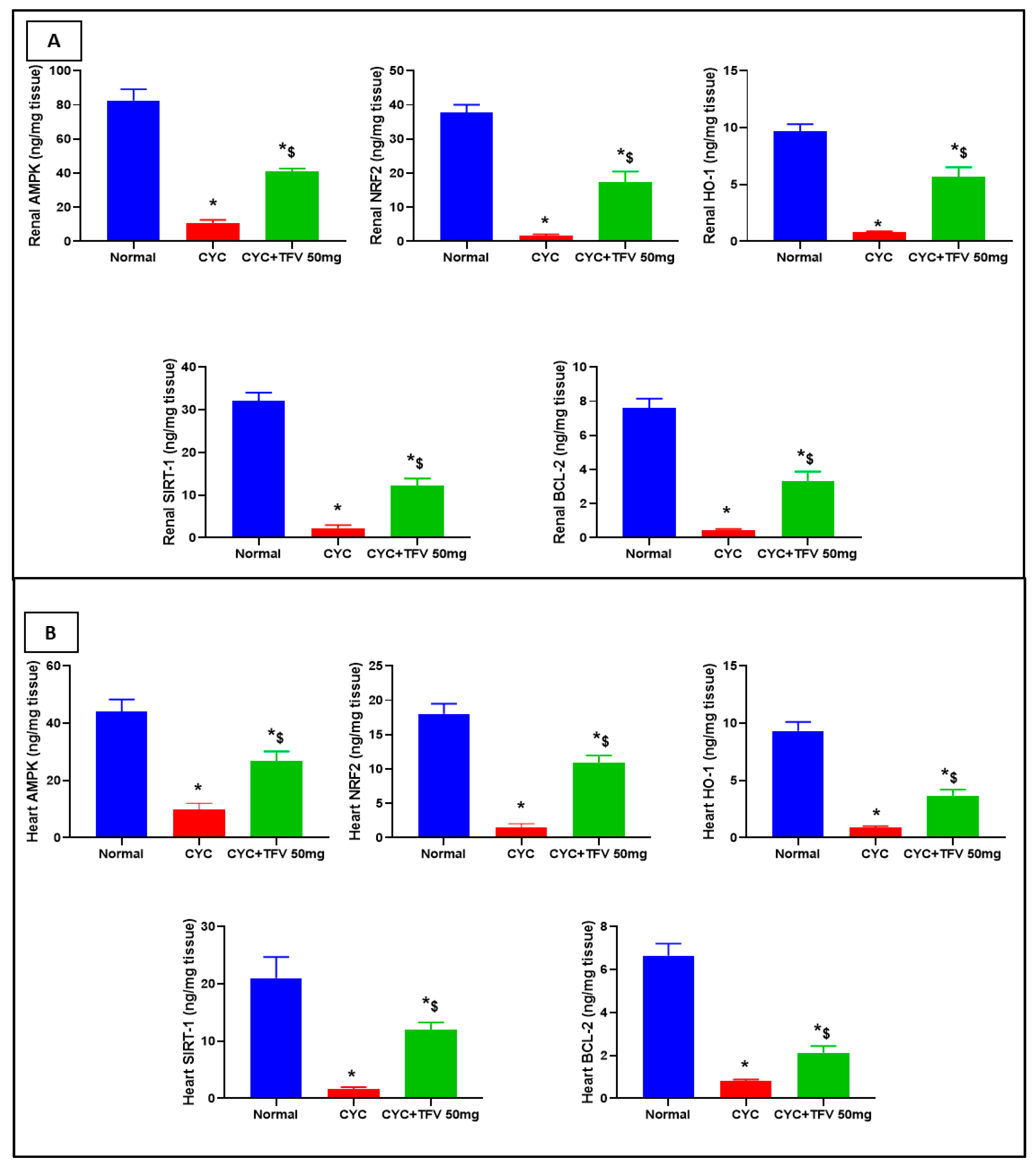 3.5. The Impact of TFV (50 mg/kg) on Renal and Cardiac AMPK, Nrf2, HO-1, Bcl-2, and SIRT1 Altered via CYC Injection