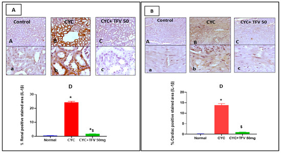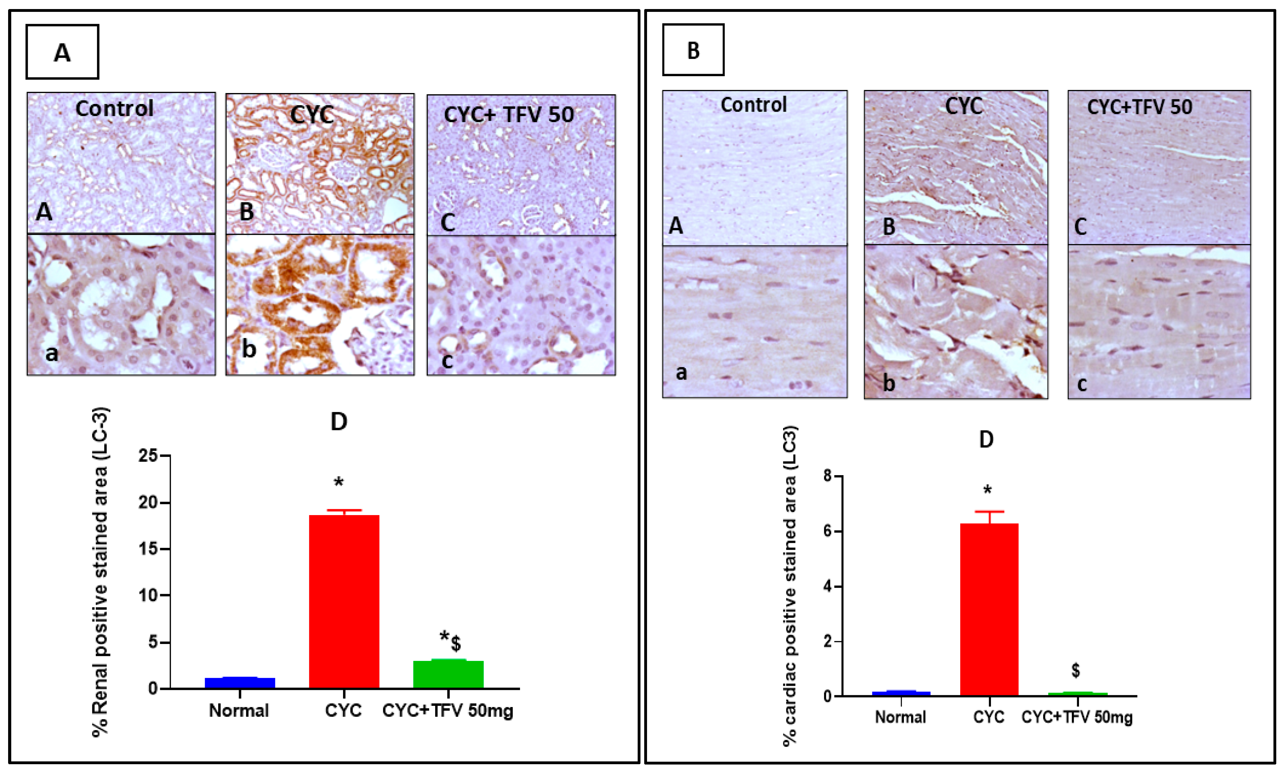 3.6. The Impact of TFV (50 mg/kg) on Renal and Cardiac IL-1B and LC3 Alteration Induced by CYC and Immunohistochemically Analyzed