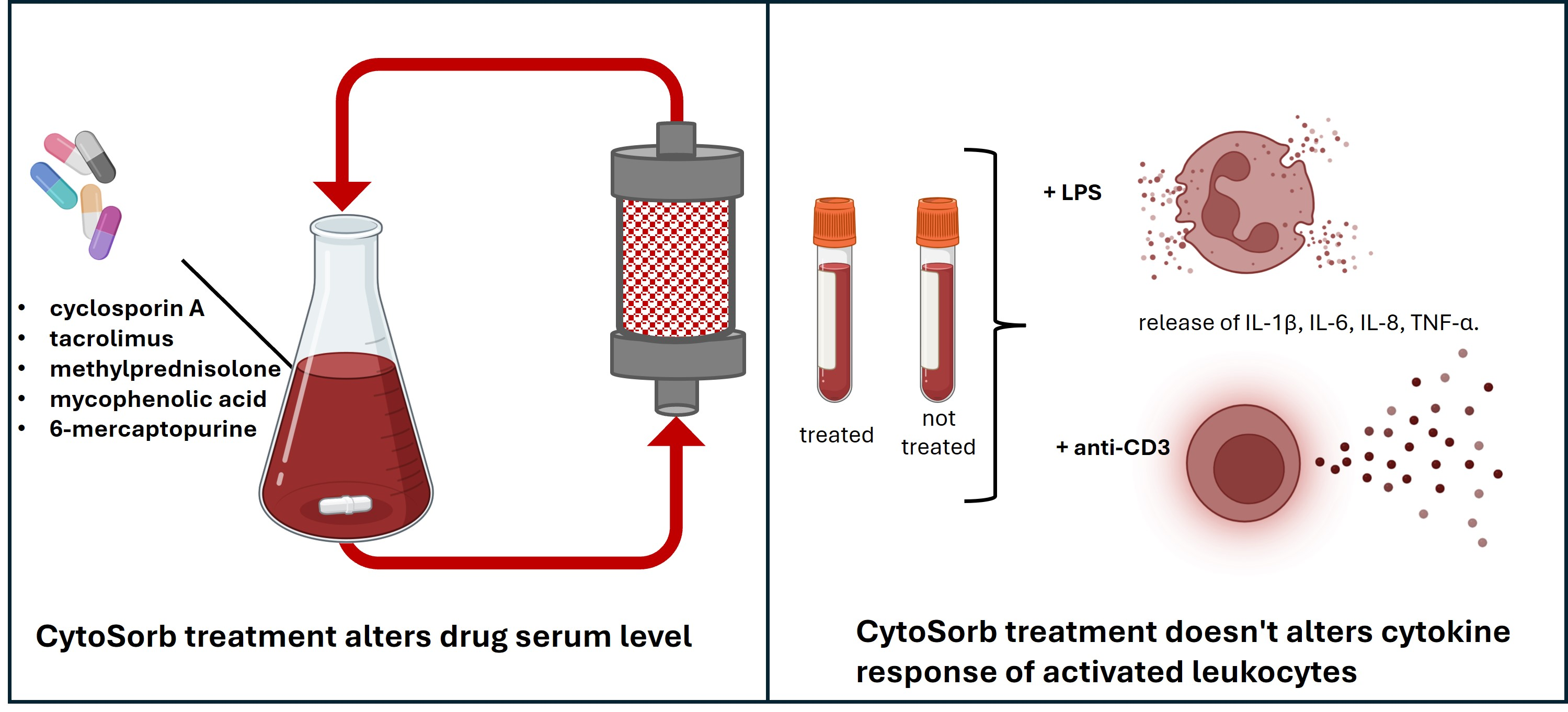 A key consideration for the use of CytoSorb in transplant patients is its potential interaction with immunosuppressive drugs. Pharmacokinetic studies in large animal models as well as in vitro systems suggest that CytoSorb has limited impact on blood levels of calcineurin inhibitors such as tacrolimus and cyclosporine, while more hydrophilic agents such as mycophenolate and corticosteroids may be adsorbed to a greater extent [2,6]. However, clinical relevance appears limited during short-term treatment.