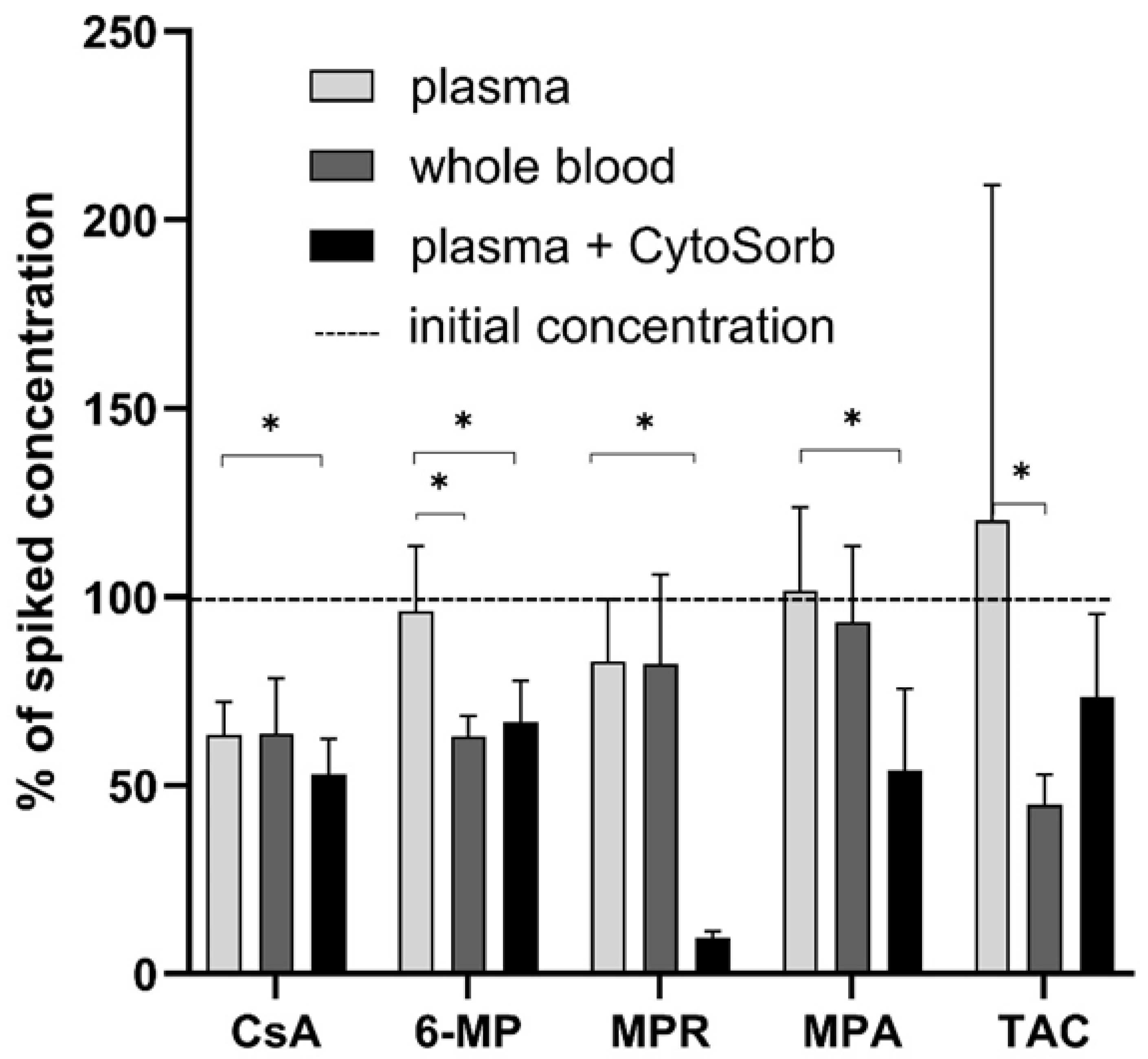 In this ex vivo study, CytoSorb treatment led to a measurable reduction in plasma levels of CsA, 6-MP, MPR, and MPA. While our results confirm that CytoSorb can reduce plasma concentrations of several immunosuppressants ex vivo, the complexity of immunosuppressive therapy in clinical practice precludes any recommendation regarding safety or dose adjustment based on this study alone.