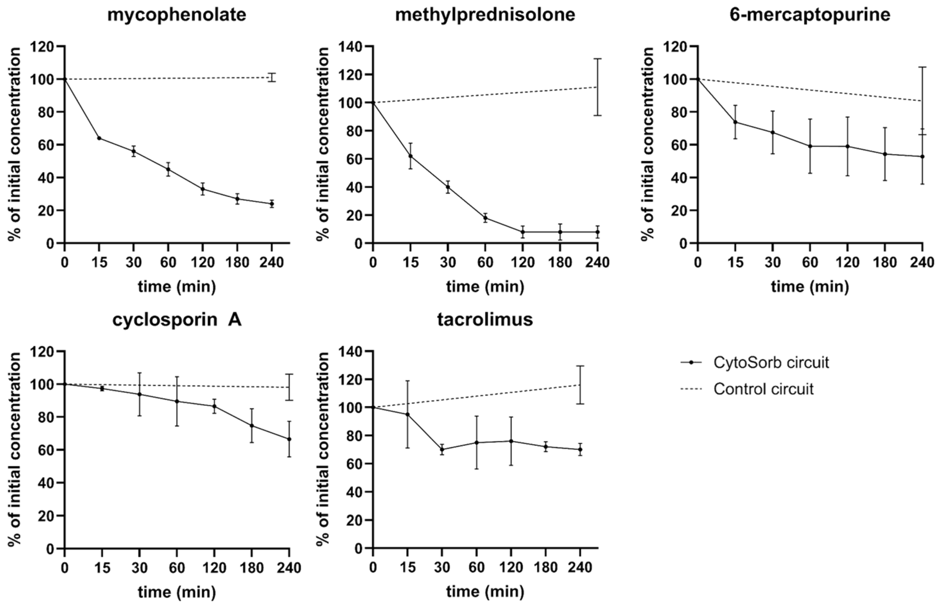 In a dynamic ex vivo setup using a scaled-down CytoSorb cartridge, four of five tested immunosuppressants were depleted from human blood. The highest adsorption was observed for MPR (92 ± 3%), followed by MPA (76 ± 2%), 6-MP (47 ± 16%), and CsA (33 ± 11%). TAC showed only minimal and statistically non-significant removal (18 ± 16%), likely due to strong plasma protein binding. Control circuits confirmed that the reductions observed were attributable to CytoSorb treatment rather than cellular uptake (Figure 3).