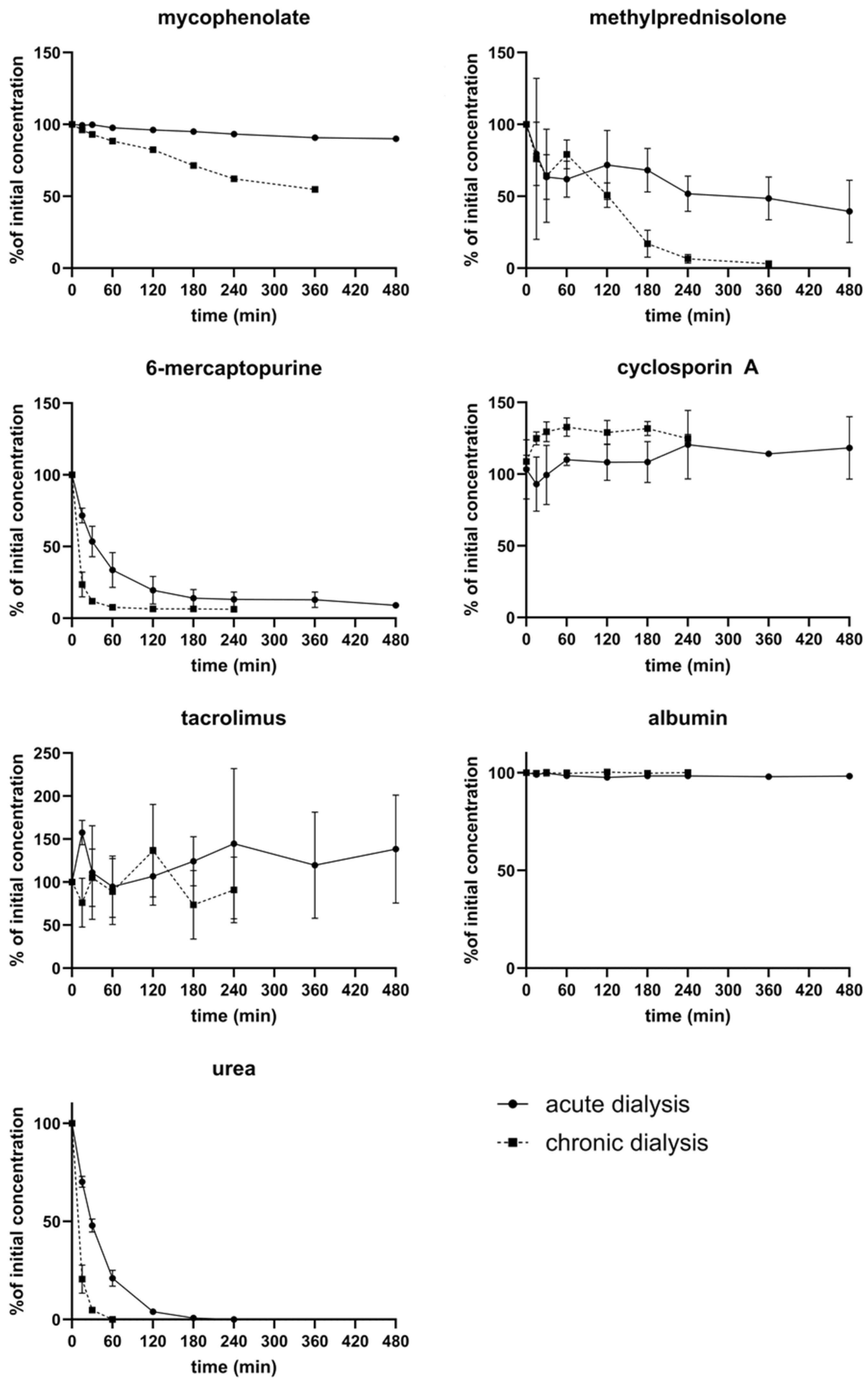 Prior to circulation, the systems were flushed with 2 L of isotonic saline. Plasma samples were collected at defined time points (15–480 min) and analyzed for immunosuppressants, urea, and albumin. Chronic dialysis represents intermittent high-flow conditions, whereas acute dialysis mimics continuous low-flow therapy used in critically ill patients.