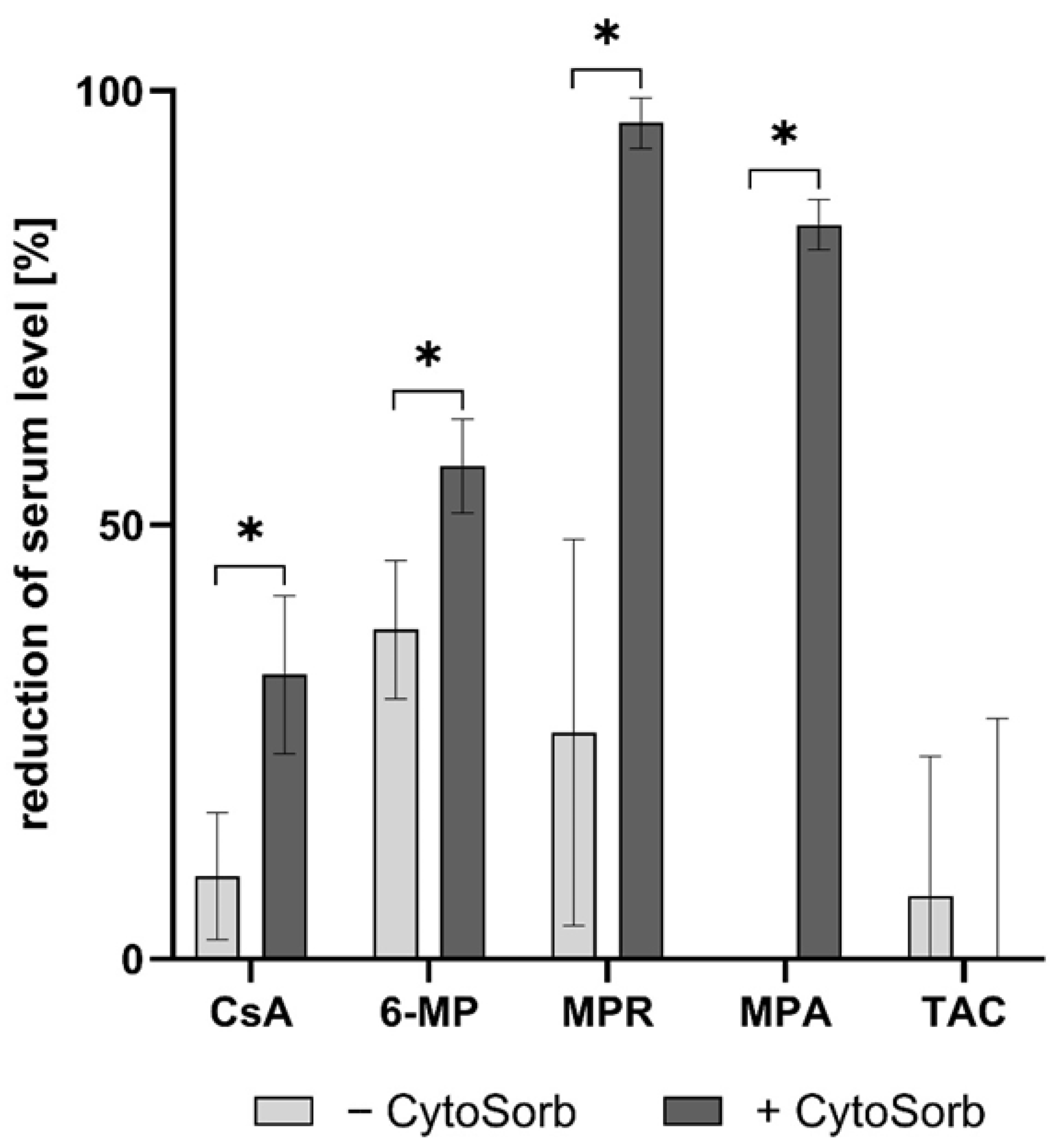 Figure 6. Reduction in immunosuppressant serum levels after CytoSorb treatment in a whole blood model (n = 6). Following overnight incubation with immunosuppressants, aliquots of the blood were either treated with CytoSorb (+CytoSorb) or left untreated (−CytoSorb). Data are presented as the percentage reduction relative to untreated controls. Significant differences (p < 0.05) are indicated by *.
