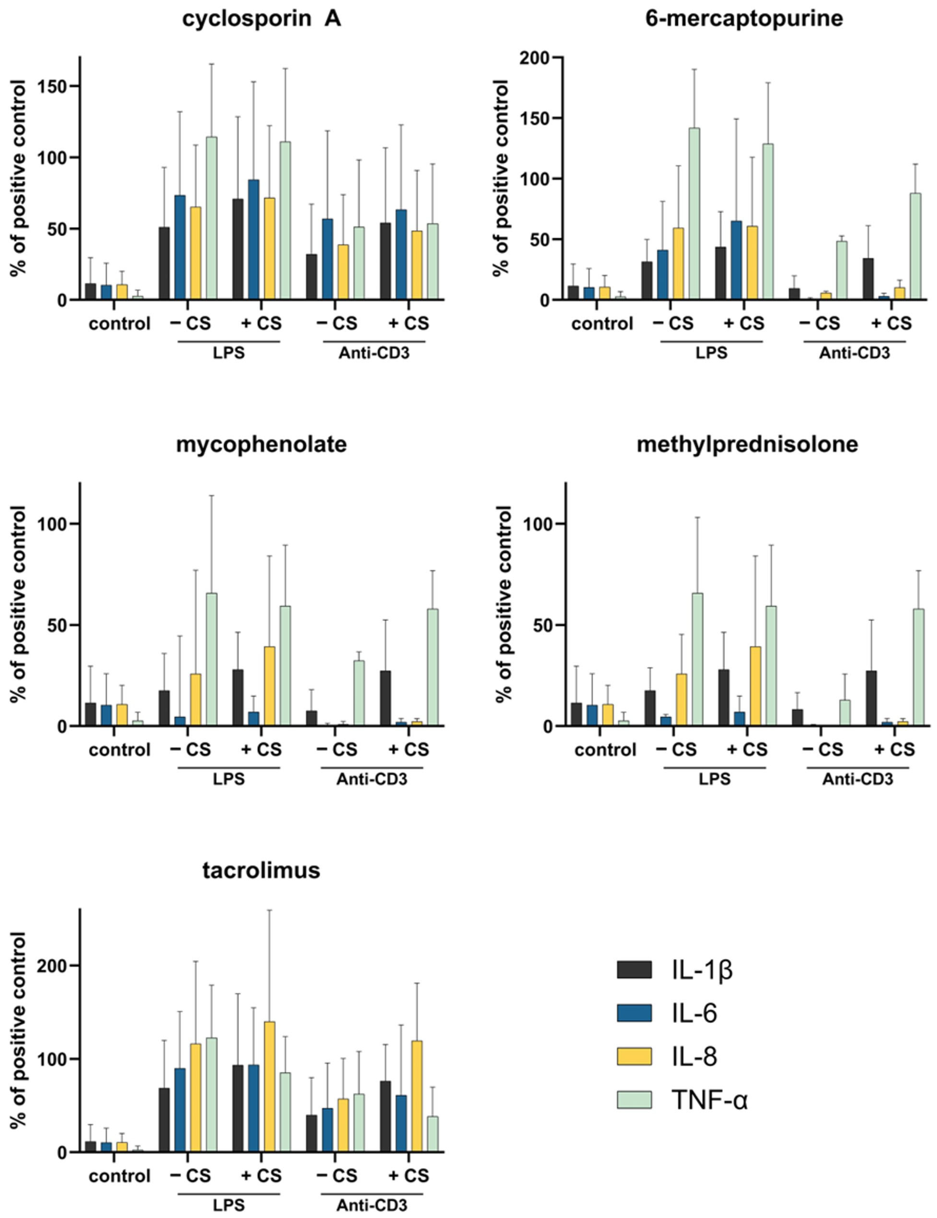 Figure 7. Effect of CytoSorb treatment on the immunosuppressive capacity in a whole blood cell model. Following CytoSorb treatment, blood samples were stimulated with LPS (E. coli) and anti-CD3 to assess the activation capability of leukocytes. After 4 h of incubation, cytokine secretion was compared between CytoSorb-treated (+CS) and untreated (−CS) samples. Data represent mean cytokine serum levels from three independent experiments (n = 3). The positive control consisted of LPS and anti-CD3-stimulated blood from the same donor without immunosuppressants and was set to 100%. Unstimulated blood without immunosuppressants served as negative control.