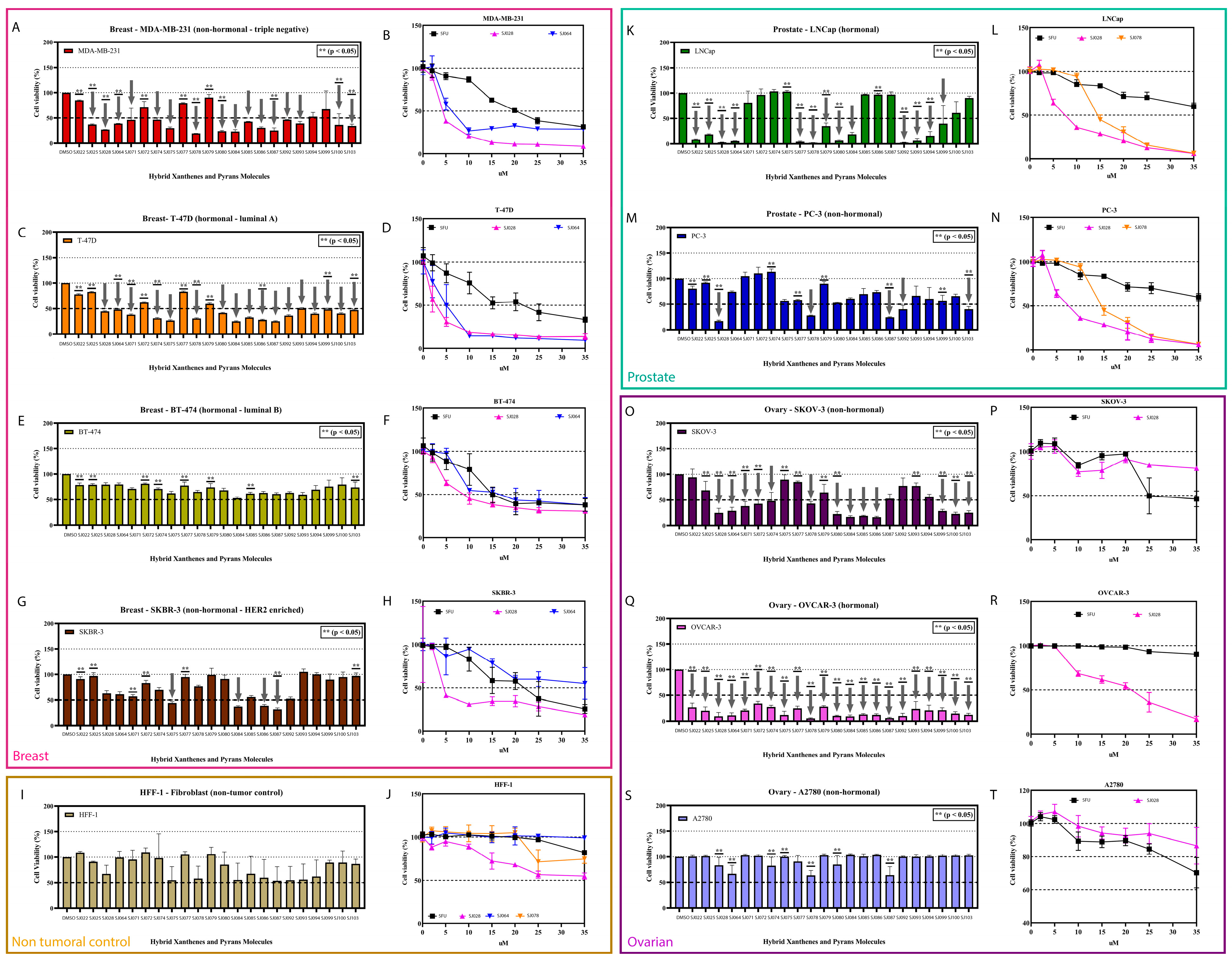 | Breast Cancer Cells | SJ028 (IC50 μM) | SJ064 (IC50 μM) | (SI) SJ028 | (SI) SJ064 |