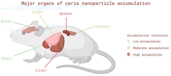The main organs of nanoceria accumulation in mice in vivo. The color scale reflects the accumulation intensity according to the data of distribution studies (high—liver, spleen; moderate—kidneys, lungs; low—brain, heart). The illustration was created using the BioRender platform.