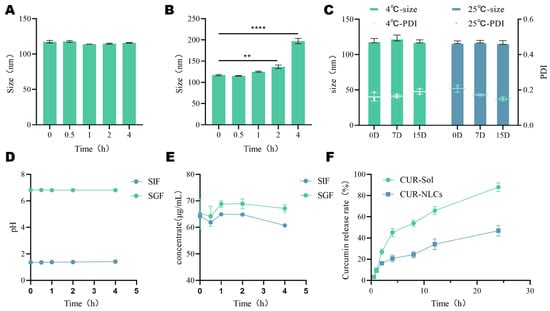 (A): Gastric stability of CUR-NLCs; (B): Intestinal stability of CUR-NLCs; (C): pH value of CUR-NLCs in gastric fluid and intestinal fluid; (D): Drug content of CUR-NLCs in gastric fluid and intestinal fluid; (E): Storage stability of CUR-NLCs; (F): In vitro release rate. Note: ** p < 0.01 and **** p < 0.0001.