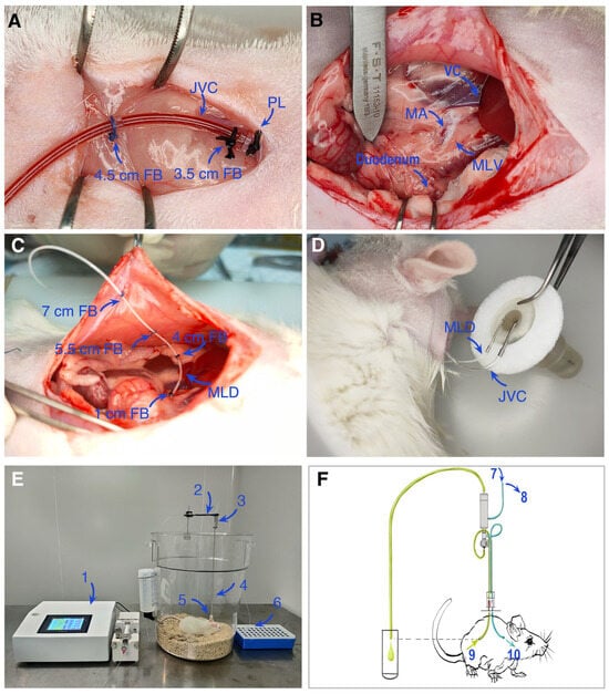 Schematic diagram and experimental setup of the mesenteric lymph duct and jugular vein catheterization model in rats. (A) Cannulation of the jugular vein for fluid administration or blood collection. (B,C) Cannulation of the mesenteric lymph duct for lymph collection. (D,E) Fluid collection devices for lymph and blood, respectively. (F) Schematic overview of the entire experimental apparatus. Abbreviations: FB, fixation buckle; JVC, jugular vein catheter; PL, proximal ligation; VC, vena cava; MA, mesenteric artery; MLV, mesenteric lymph vessel; MLD, mesenteric lymph duct; JV, jugular vein; 1, micro-infusion pump; 2, counterbalance arm; 3, 2-channel swivel; 4, VAB tether; 5, VAB; 6, lymph fluid collection tube; 7, reservoir of Ringer’s solution; 8, jugular vein blood collection tube; 9, mesenteric lymph vessel; 10, jugular vein; Blue tube: jugular vein catheter; Green tube: Mesenteric lymphatic duct.