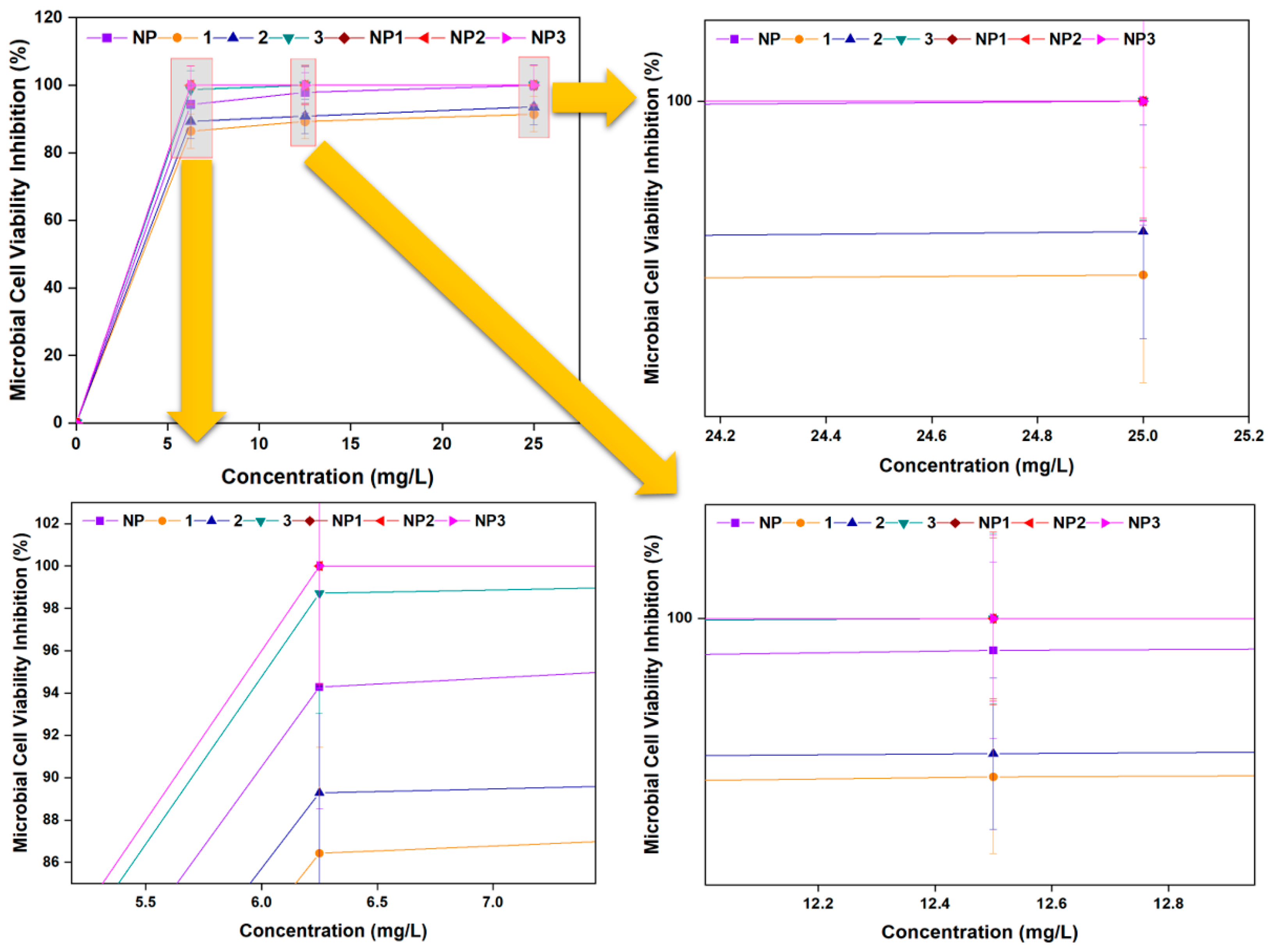 3.3.3. Microbial Cell Viability Inhibition