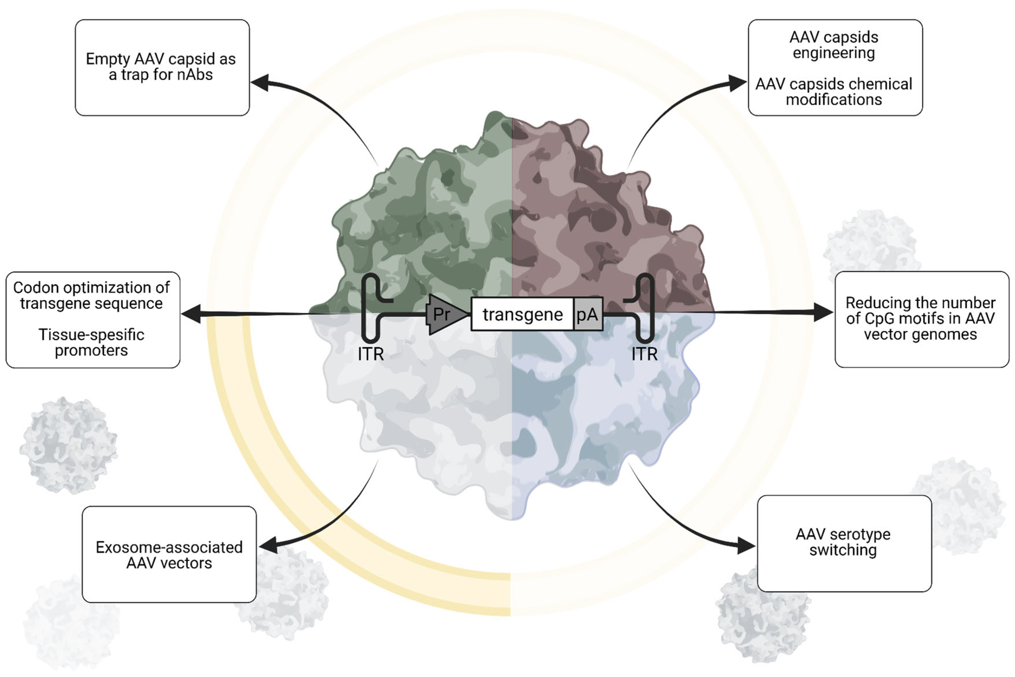 | Empty capsids decoys | Reduces capturing of full capsids by pre-existing circulating antibodies | May provoke Ig-mediated immune reactions May reduce target tissue’s transduction due to competition for the AAV receptor Lack of methods for efficient empty capsid purification | [69] |