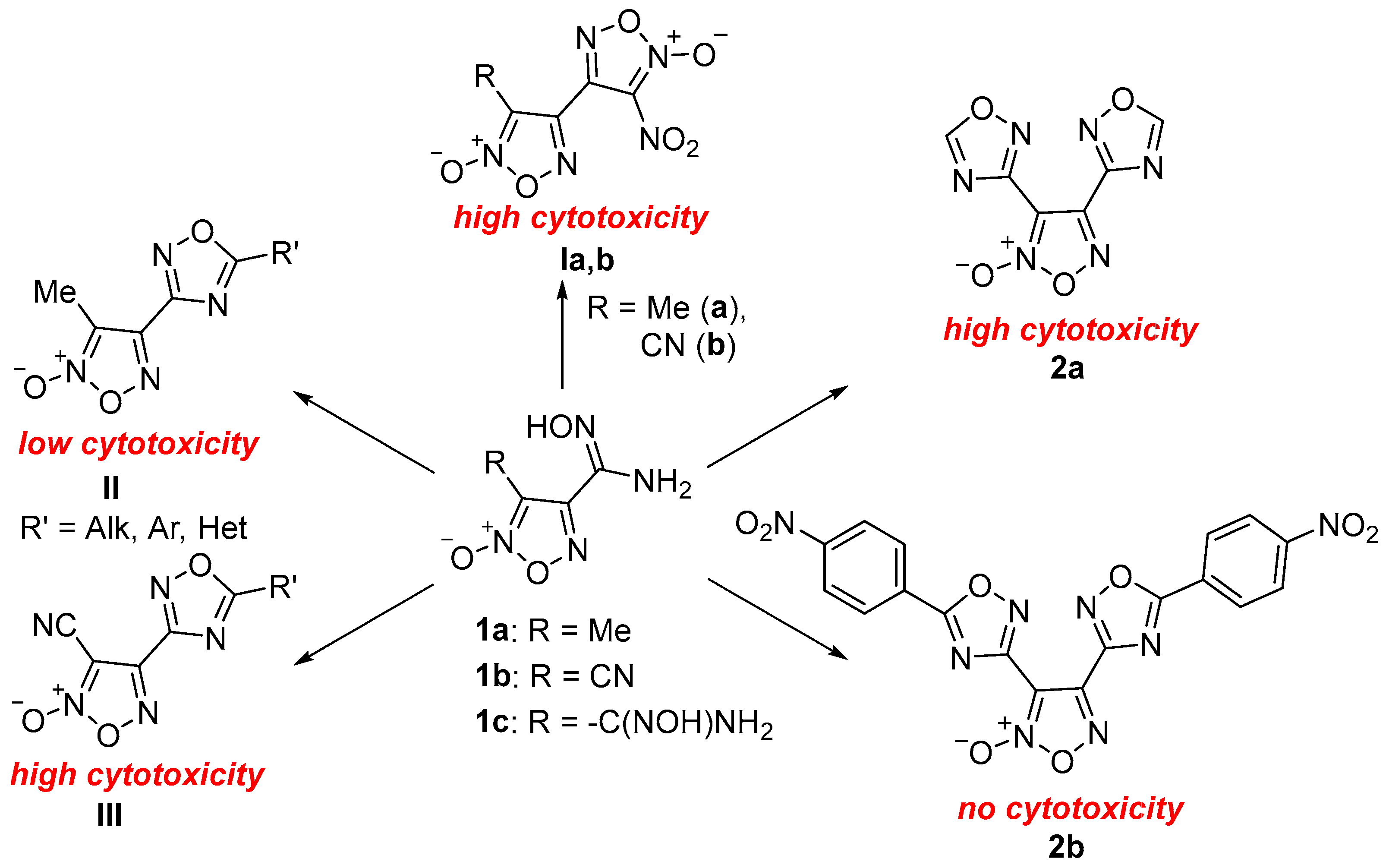 - Kulikov, A.S.; Larin, A.A.; Fershtat, L.L.; Anikina, L.V.; Pukhov, S.A.; Klochkov, S.G.; Struchkova, M.I.; Romanova, A.A.; Ananyev, I.V.; Makhova, N.N. Synthesis, structural characterization and cytotoxic activity of heterocyclic compounds containing the furoxan ring. Arkivoc 2017, 2017, 250–268. [Google Scholar] [CrossRef]