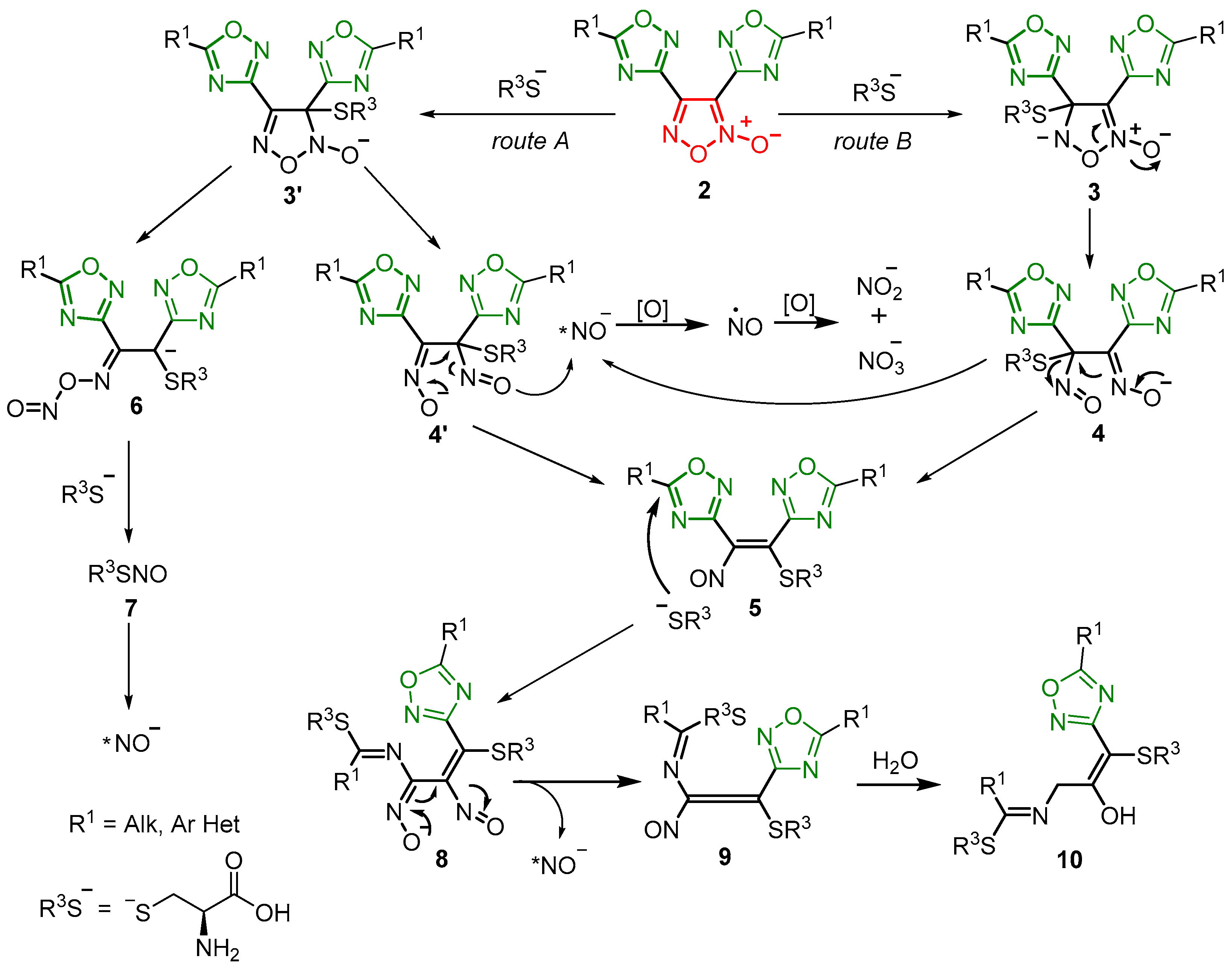 - Fershtat, L.L.; Makhova, N.N. Molecular Hybridization Tools in the Development of Furoxan-Based NO-Donor Prodrugs. ChemMedChem 2017, 12, 622–638. [Google Scholar] [CrossRef] [PubMed]