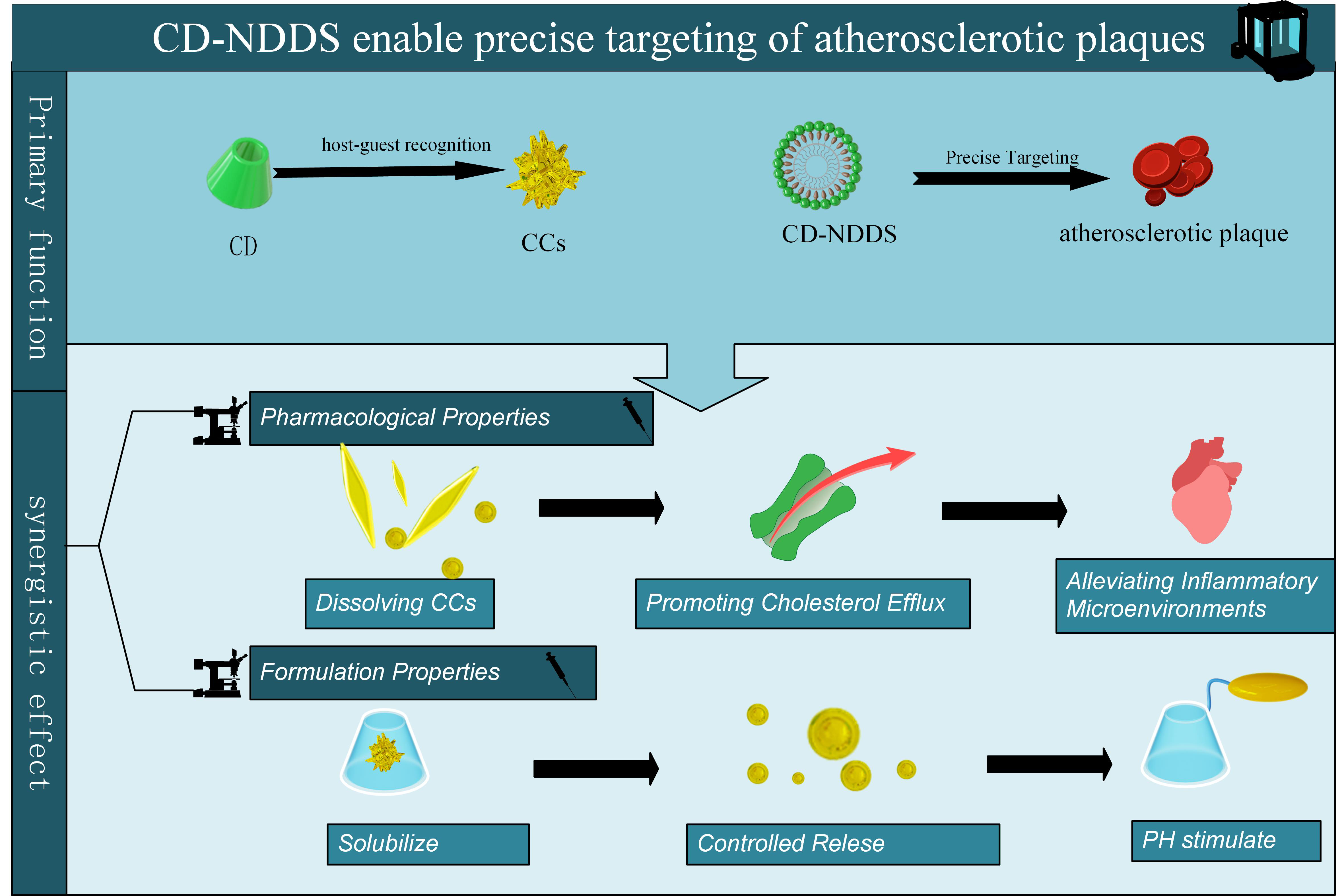 | β-CD | Polymeric Nanoparticle | PLGA-NPs | Atorvastatin (hepitorin) | HA | ApoE−/− mice (apolipoprotein E gene knockout mice) | Intravenous injection | Enhanced drug solubility, sustained release | Enhance drug bioavailability, reduce systemic toxicity, and improve targeting efficiency | [153] |